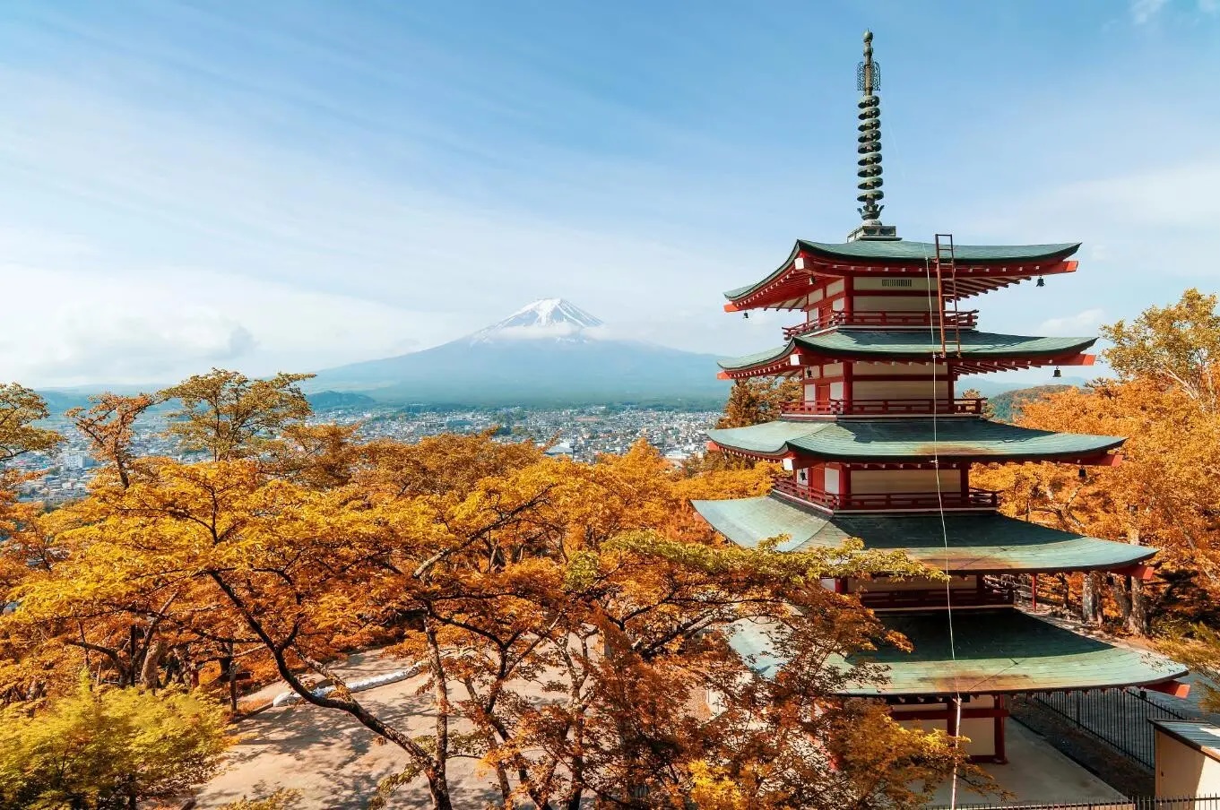 觀賞富士山全景的絕佳位置,每年春天更是拍櫻花及富士山的絕景之地,而 11 月秋天樹葉變色,更完美襯托赤紅色的寶塔。