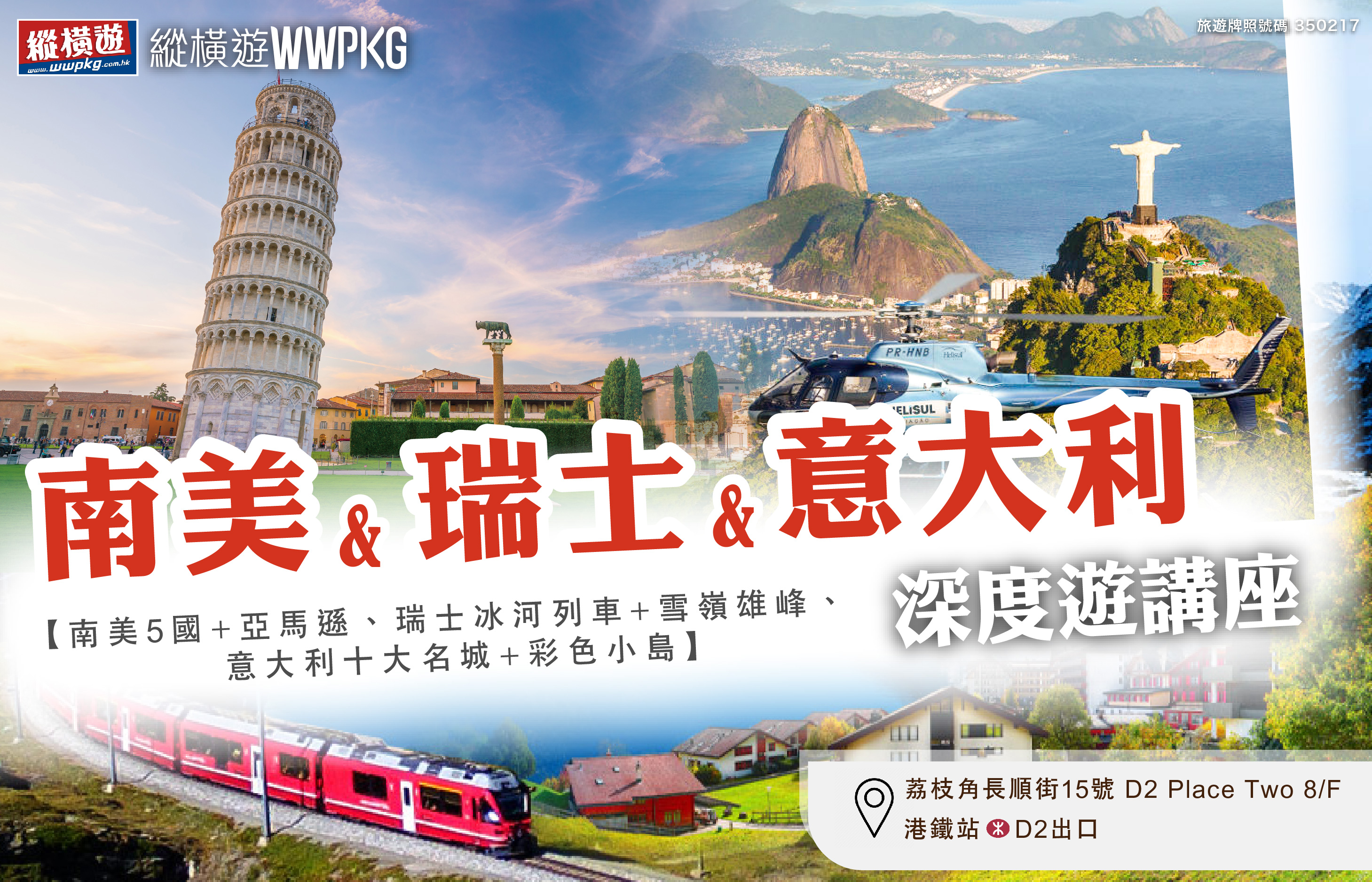 參加我們的[長線深度遊<南美5國>、<瑞士純遊>、<意大利純遊>¦旅遊講座],希望有你心目中的理想目的地。