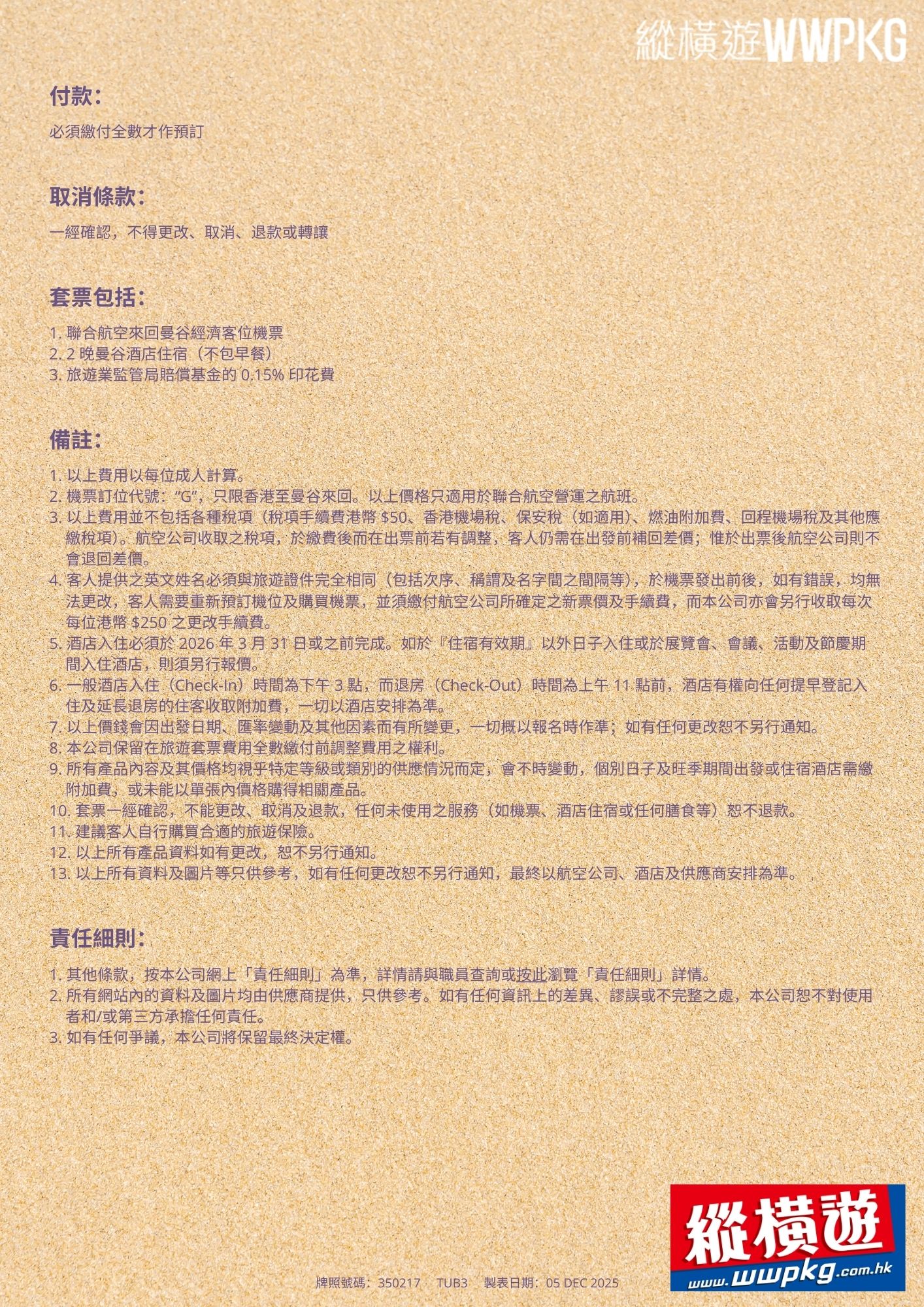 2) 2 晚曼谷酒店住宿(不包早餐)