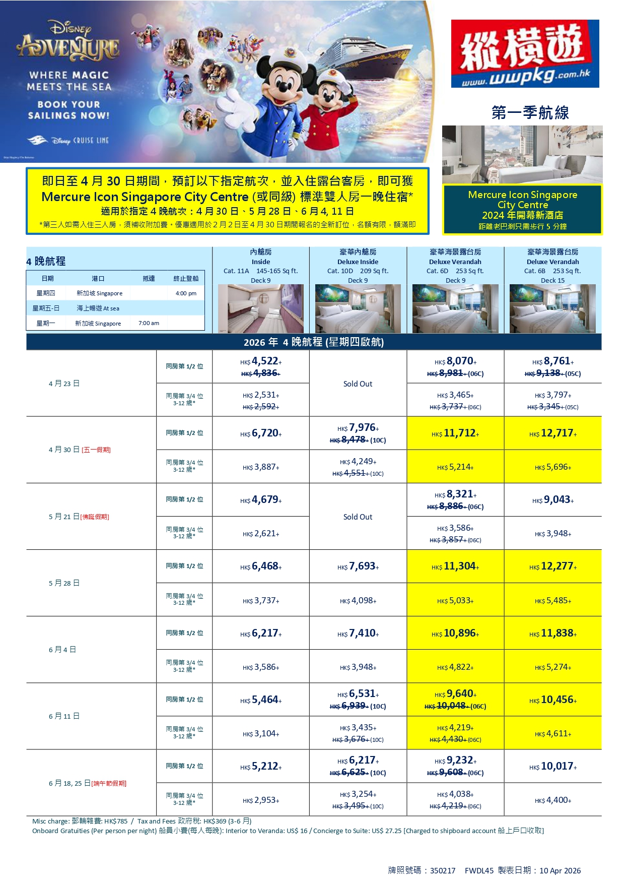 迪士尼探險號 Disney Adventure .4晚新加坡之旅船票 (2026年4 -12月 逢星期四啟航)