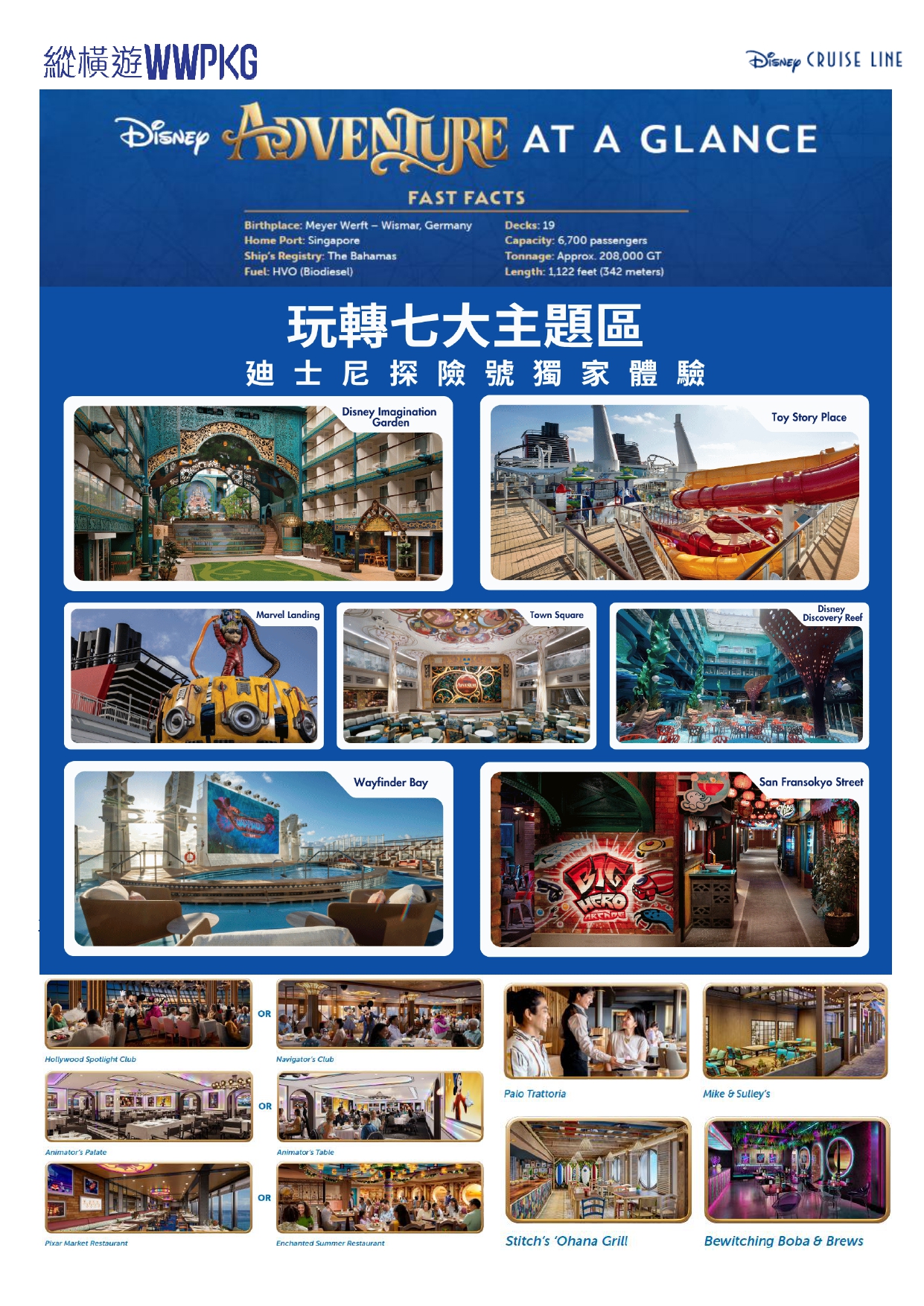 「迪士尼探險號」(Disney Adventure) — 暢玩七大主題區。迪士尼、皮克斯和漫威將其標誌性的故事、奇妙和幻想注入其中,是您全家的理想度假選擇。