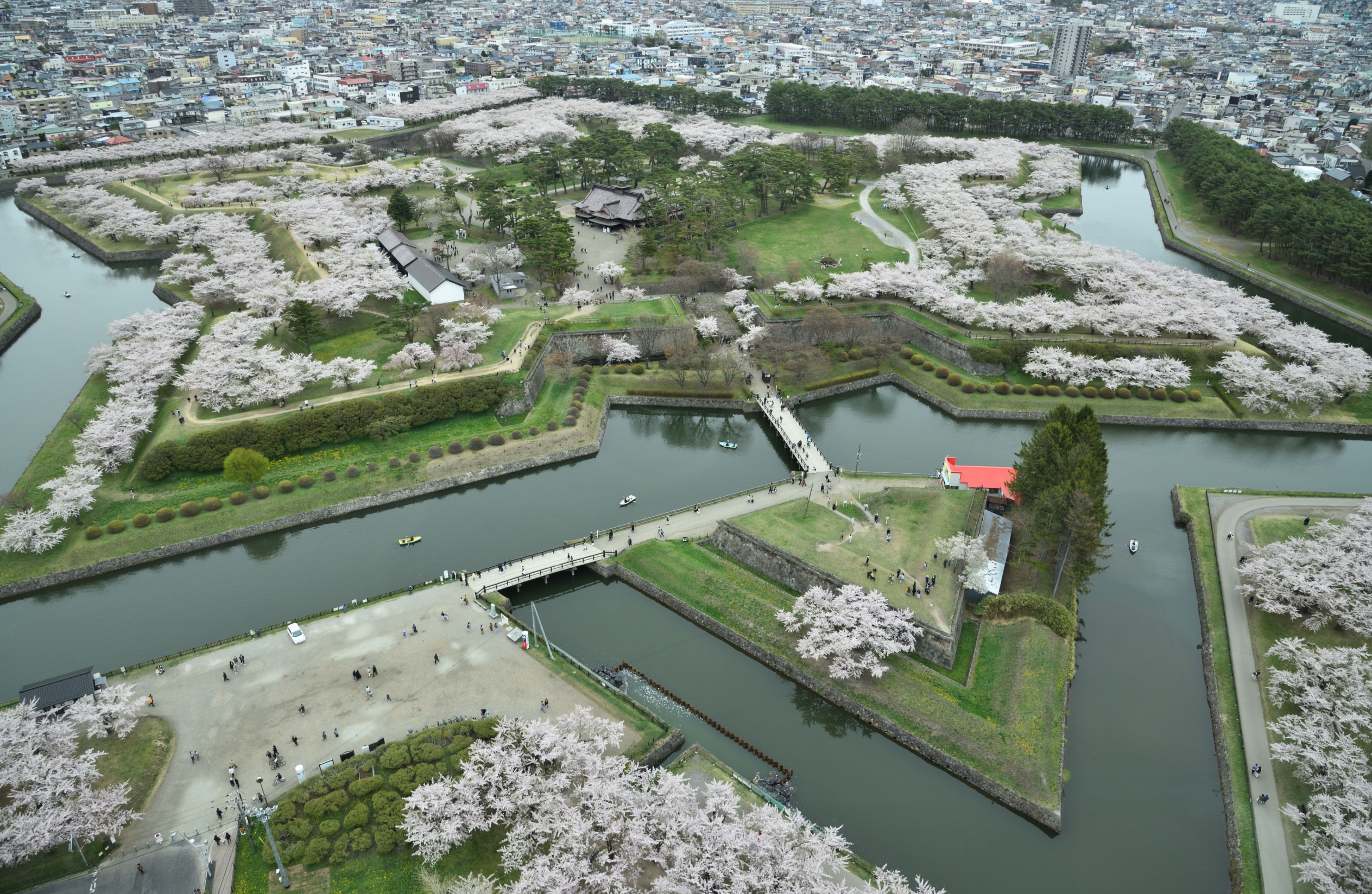 函館五稜郭公園堪稱北海道最具代表性的賞櫻勝地,園內種植了約1500株染井吉野櫻。遊客可登上五稜郭塔,從高處眺望星形城郭被粉色花海環繞的壯麗景致,將歷史建築與自然美景盡收眼底。