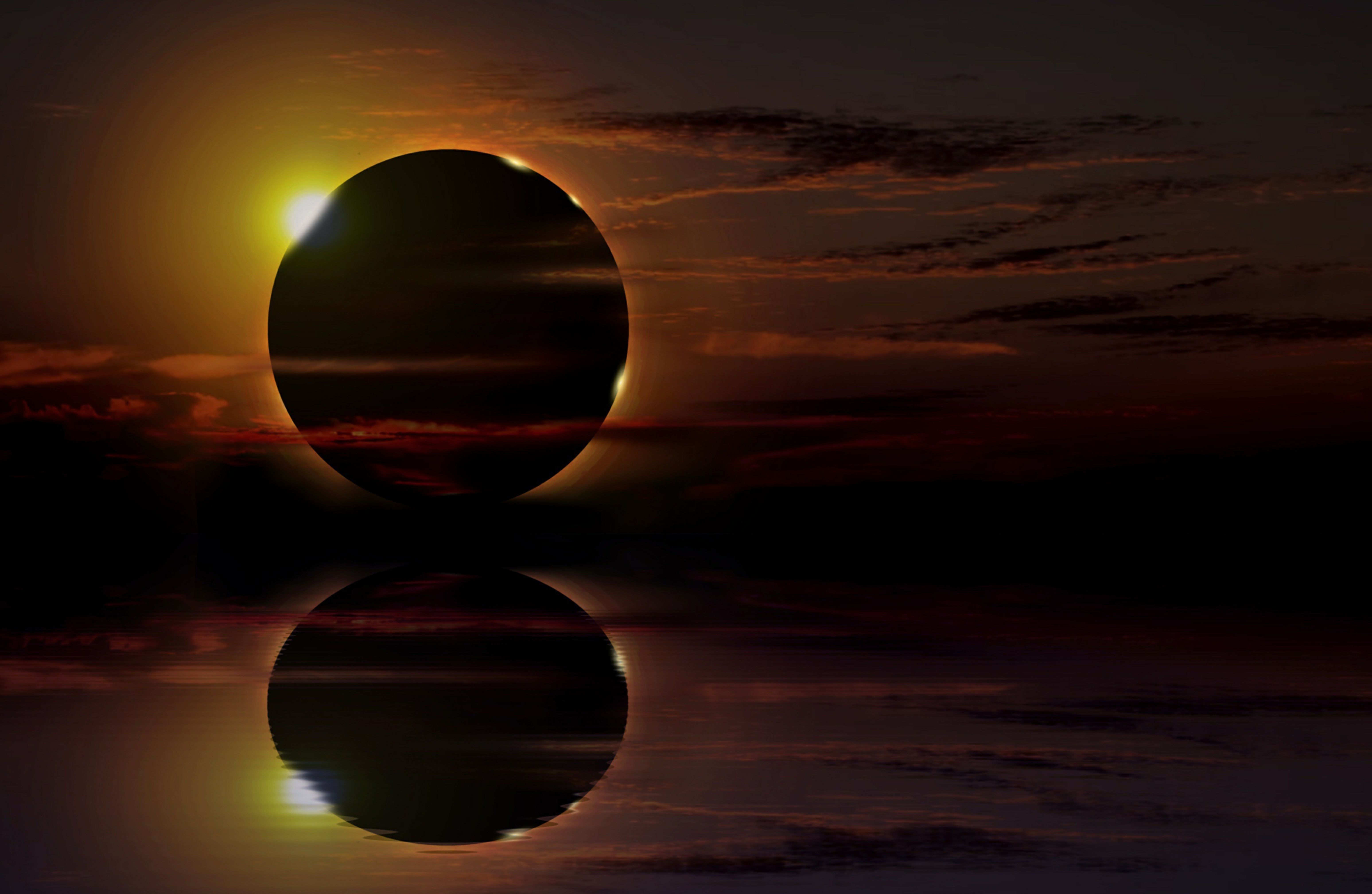 日全食是罕見壯觀的天文現象,當月球運行至太陽與地球之間並完全遮蔽太陽時發生,通常僅持續數分鐘。過程包含五個階段:初虧(月球開始遮掩太陽)、食既(太陽完全被遮,全食開始)、食甚(遮蔽面積最大)、生光(太陽開始重現)與復圓(日食結束)。此時天空會驟然變暗,可觀測到日冕、貝利珠與鑽石環等奇景。觀測時須注意安全,僅有在太陽完全被遮蔽的全食階段才能以肉眼直視,其餘時間必須使用專用日食眼鏡,否則將造成視力永久損傷。由於月球本影僅掃過地球表面極窄的路徑,在同一地點觀測到日全食極為罕見,平均約需400年才會出現一次。