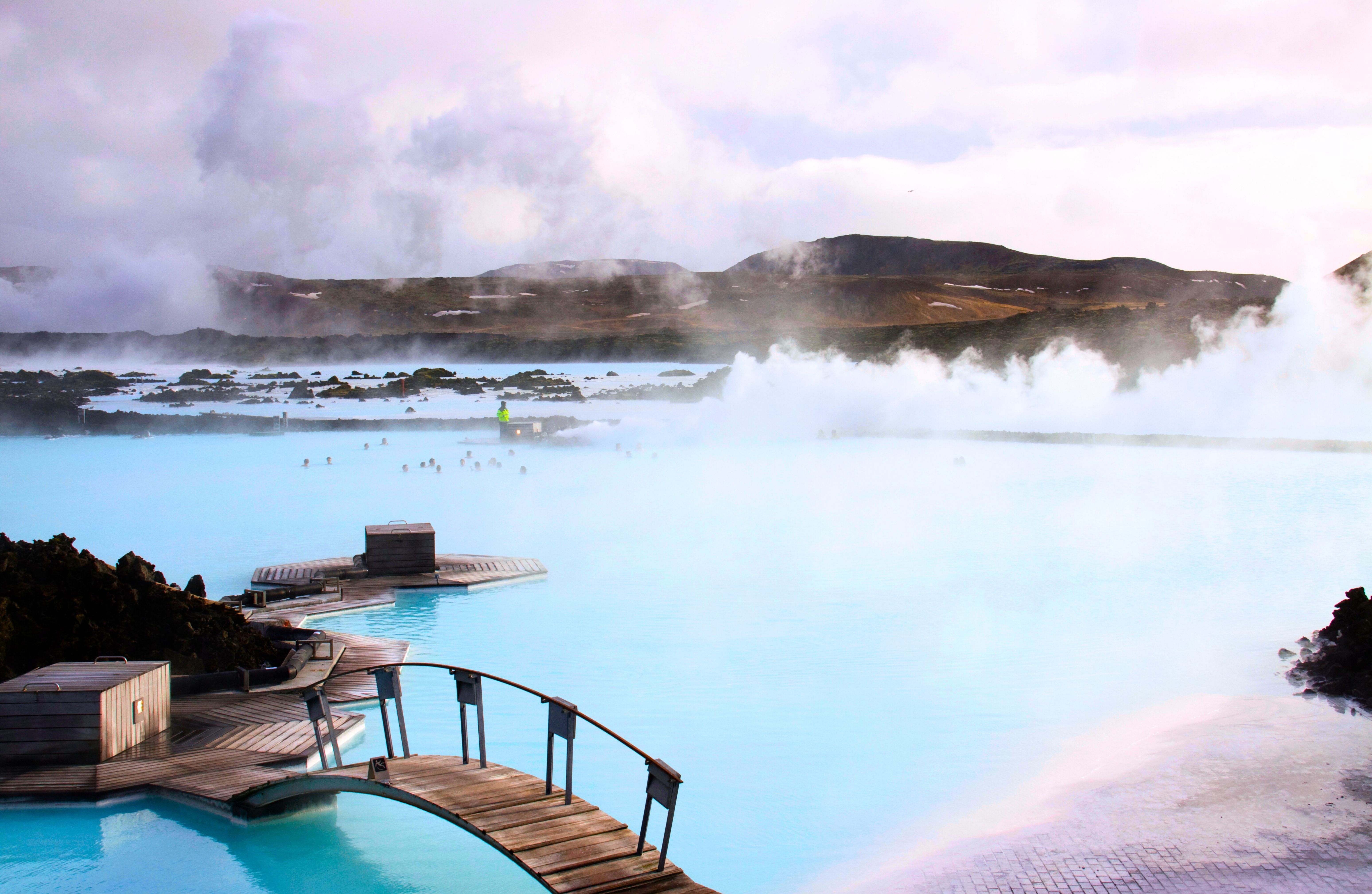 藍湖溫泉是冰島最著名的地熱溫泉,被評選為世界十大水療SPA之一。這個位於雷克雅維克和凱夫拉維克機場之間的溫泉度假村,其乳藍色的溫泉水來自地下2000米的地熱海水,水溫常年保持在37-39°C,富含硅、硫磺和藻類等礦物質,具有美顏養生的功效。