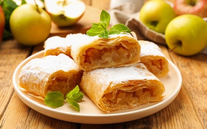 如果你喜歡肉桂香氣,這絕對是你的首選,其精髓在於「薄如蟬翼」的酥皮——據說要薄到能透過麵皮閱讀報紙。內餡豐富地填滿酸甜蘋果丁、肉桂粉、葡萄乾及烤香的麵包屑,層次豐富。最道地的品嚐方式是趁熱享用,並淋上溫熱的香草醬,讓醬汁與酥皮、果餡完美融合。在維也納的咖啡館文化中,點一杯維也納米朗奇咖啡 (Wiener Melange) 搭配蘋果捲,悠閒地度過整個下午,正是當地人最愜意的生活寫照,體現了奧地利獨特的慢活哲學與甜點藝術。