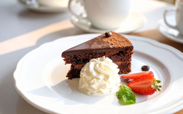 奧地利最具代表性的甜點非它莫屬,地位崇高到曾引發多年的「正統配方」爭議。這款經典巧克力蛋糕以濃郁的可可蛋糕體為基底,中間夾著一層酸甜適中的杏桃果醬,最外層覆蓋著光滑亮麗的巧克力鏡面淋醬。品嚐時講究搭配一球無糖的打發鮮奶油(Schlagobers),利用鮮奶油的輕盈清爽口感來中和巧克力的濃郁甜膩,達到完美的味覺平衡,這也是最道地的奧地利吃法。