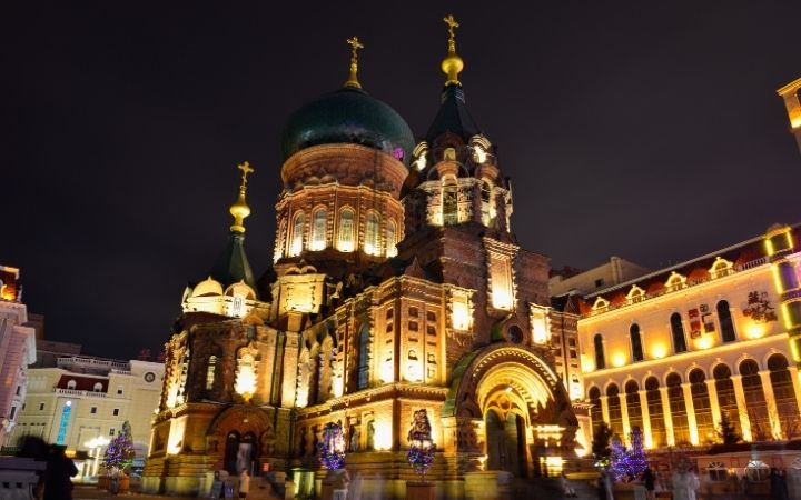 廣場以百年歷史的聖索菲亞大教堂(St. Sophia Cathedral)為核心,是哈爾濱市內的地標。這座建於1907年的東正教教堂,擁有宏偉的洋蔥頭式穹頂和拜占庭式建築風格,是中國現存最大最完整的東正教建築,現已改為建築藝術館展示城市歷史。廣場環境優美,綠樹成蔭,冬季則可以觀賞雪景。夜間燈光璀璨,設有噴泉、花壇等休閒設施,周邊商場餐廳林立,形成熱鬧的商業區,是體驗哈爾濱「東方小巴黎」歐式風情的最佳去處。