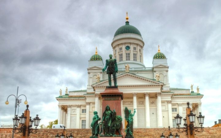 赫爾辛基主教座堂(Helsingin tuomiokirkko)是芬蘭首都最具代表性的地標建築,以純白色外觀和五個綠色圓頂聞名於世。這座19世紀初建造的新古典主義教堂坐落於市中心參議院廣場,其宏偉的建築在城市各處都清晰可見,內部則保持簡潔莊嚴的設計風格,展現出寧靜肅穆的宗教氛圍。