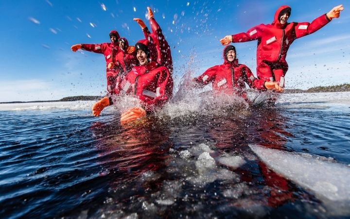 參加者將穿著紅色特製浮水衣在冰冷海域中安全漂浮,由專業人員全程陪同確保安全無虞,同時還能親眼見證破冰船「三寶號」破冰前進的壯觀景象,是一次結合刺激與安全的難忘極地探險。