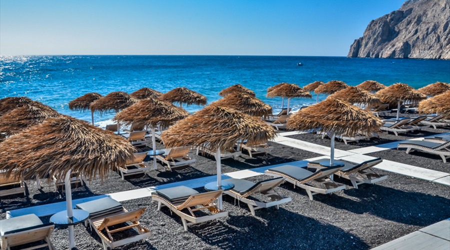 卡馬利海灘(Kamari Beach)坐落於聖托里尼島東南部,是島上規模最大且最知名的「黑沙灘」。這片海灘由火山噴發後的黑砂與鵝卵石風化而成,獨特的黑色砂石在陽光下閃爍著點點光芒,與獲得「藍旗」認證的湛藍純淨海水形成強烈對比。海灘南端矗立著壯麗的梅薩沃諾山(Mesa Vouno),山頂即是古錫拉遺址,不僅為海灘增添了雄偉的背景,更提供了俯瞰愛琴海全景的絕佳視角。