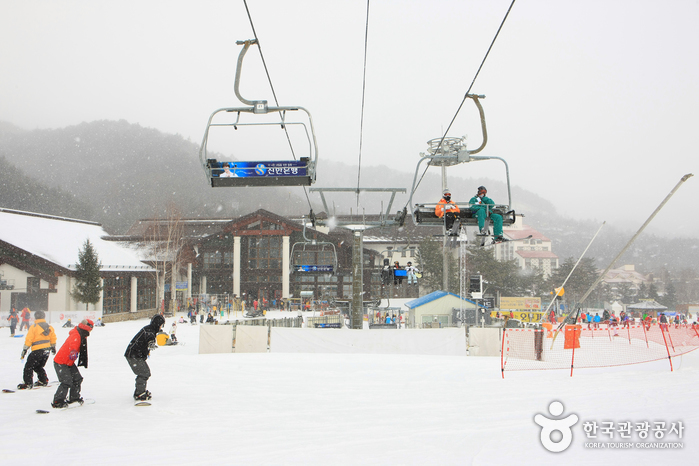 龍平滑雪場是韓國最大且最著名的滑雪度假村之一,也是2018年平昌冬季奧運會的比賽場地。這裡擁有28條滑雪道,涵蓋初級、中級和高級等不同難度,總長度超過31公里。滑雪場海拔從700公尺延伸至1,458公尺,垂直落差達700公尺,提供絕佳的滑雪體驗。