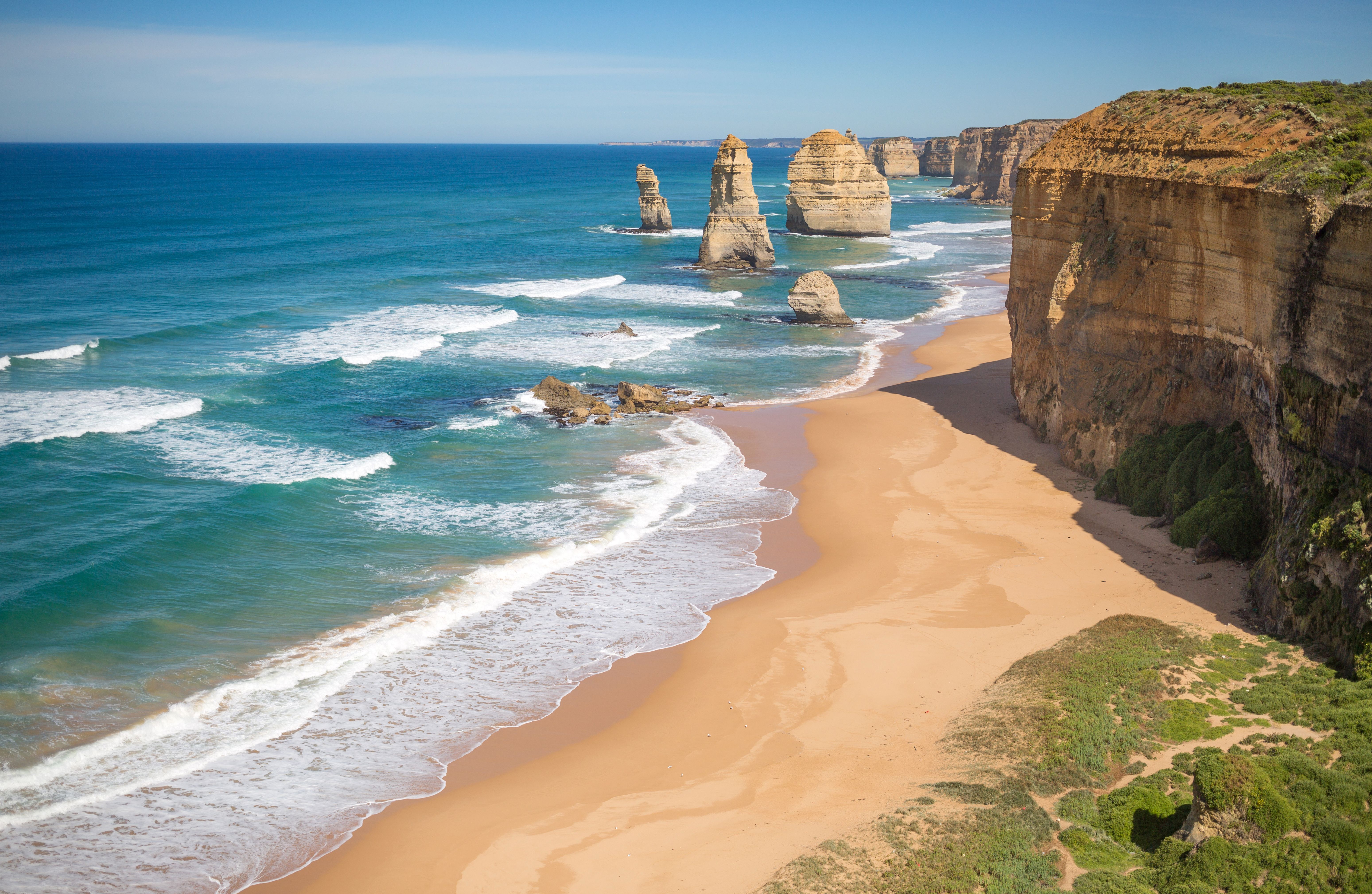 十二門徒石(Twelve Apostles)位於澳洲墨爾本西南方的坎貝爾港國家公園內,是大洋路最著名的地標景點,由數千年來南大洋海浪侵蝕形成的壯觀石灰岩柱組成。這些原本與大陸相連的岩石經過長期風化,先形成拱門後坍塌成海中孤立石柱,雖名為「十二門徒」但據紀錄從未有過12塊,目前受自然侵蝕影響僅剩7塊可供觀賞。建議在日落時分造訪,此時岩石會隨光線變換呈現紅、橙等層次色澤,尤以12月至2月的夏季最為適宜,白晝較長且天氣宜人,是欣賞這片壯麗海岸景觀的最佳時機。