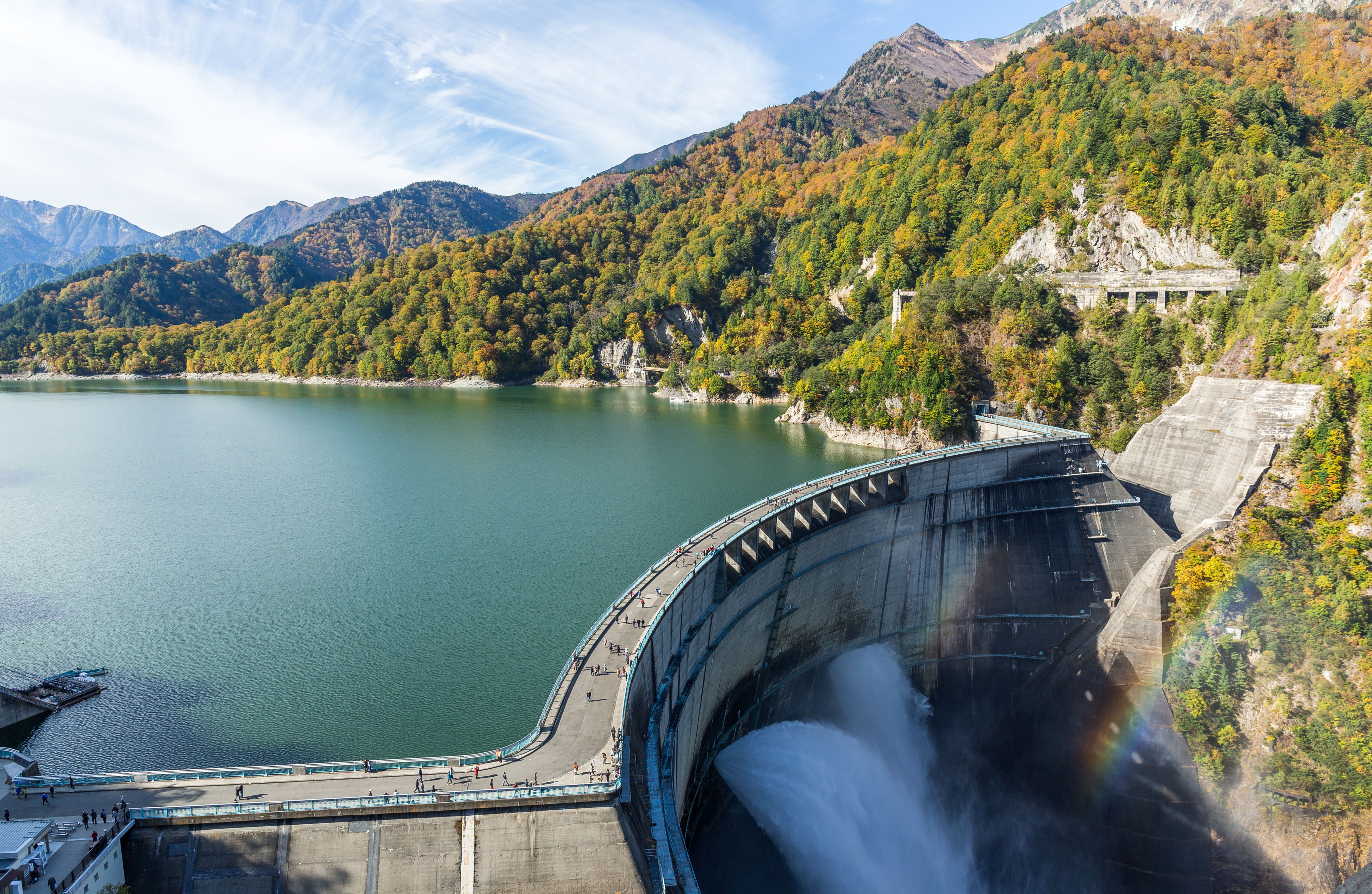 黑部水壩是日本最高的拱形水壩,高度達186公尺,建造時耗費了七年時間和一千萬人力,被稱為「世紀工程」。每年六月到十月,水壩會進行觀光放水,水柱噴發的景象相當壯觀。站在水壩展望台上,可以俯瞰整個黑部湖和周圍的群山,視野極佳。