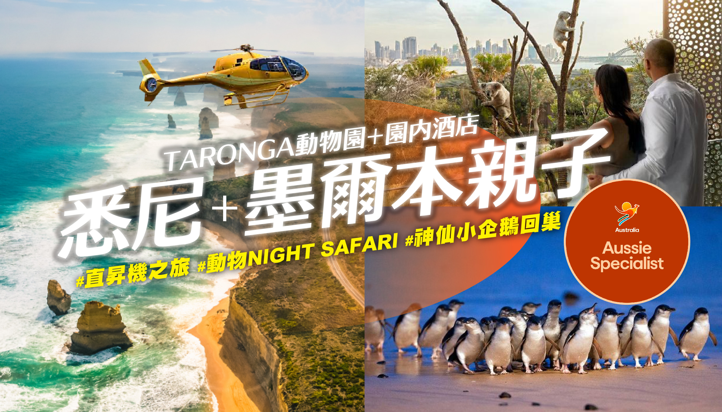 [8天][與樹熊做鄰居] 澳洲航空.直航來回.悉尼.墨爾本.8大親子行程 .動物NIGHT SAFARI.十二門徒石直升機之旅.神仙企鵝回巢VIP席.廚師帽餐廳PANCAKE ON THE ROCKS .[米芝蓮推介住宿] TARONGA豪華野生動物酒店[全包行程膳食]