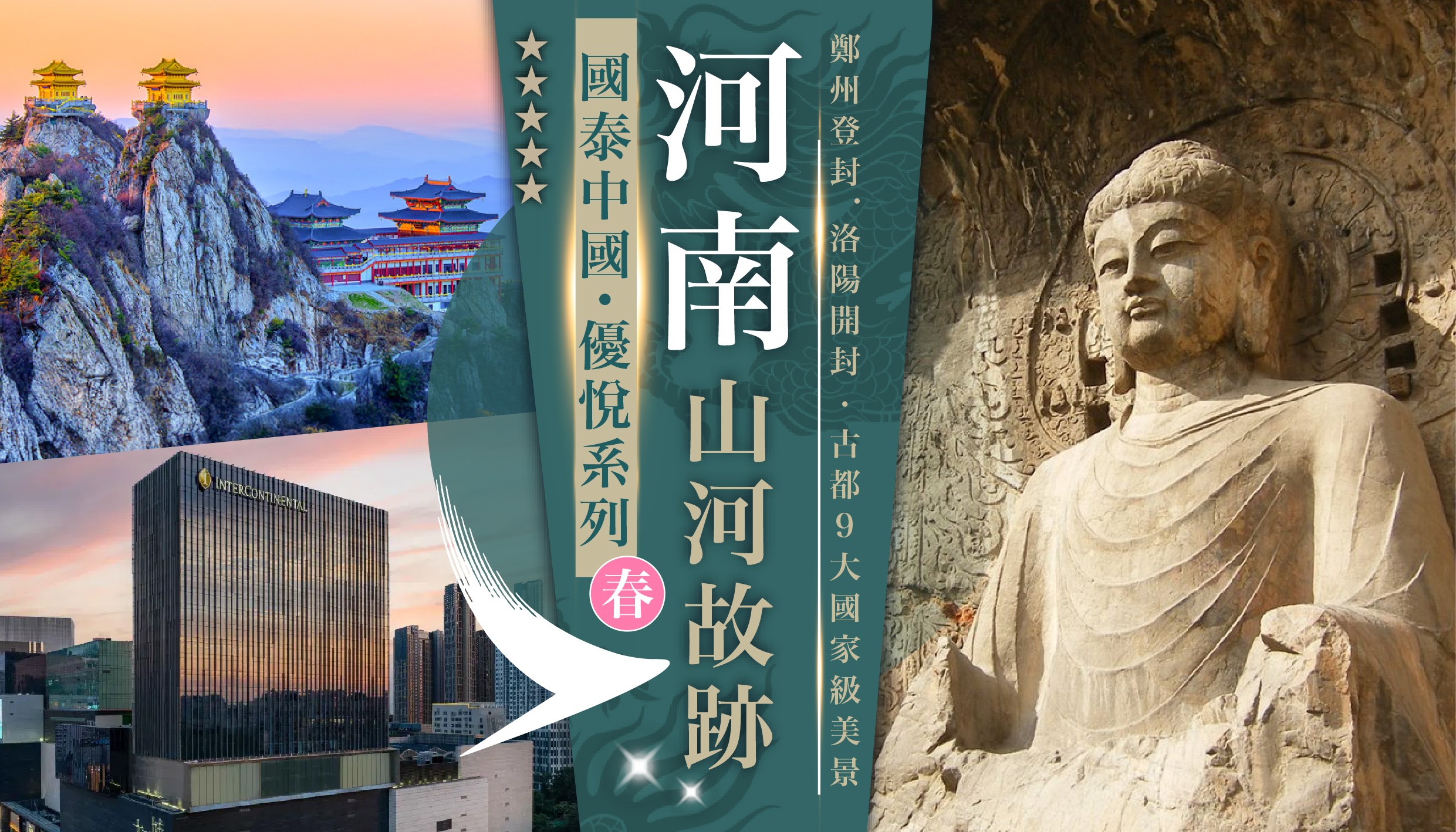 [8天] [河南優悅] 鄭州登封.洛陽開封.2大世產 [龍門石窟+少林寺].國泰航空.古都9大國家級美景.道教聖地 [老君山+追夢谷].清明上河園.中國十大名寺 [相國寺].黑珍珠美饌 [遠洋私廚].武皇盛宴半水席.4晚國際5星 [全包行程膳食.純玩行程]