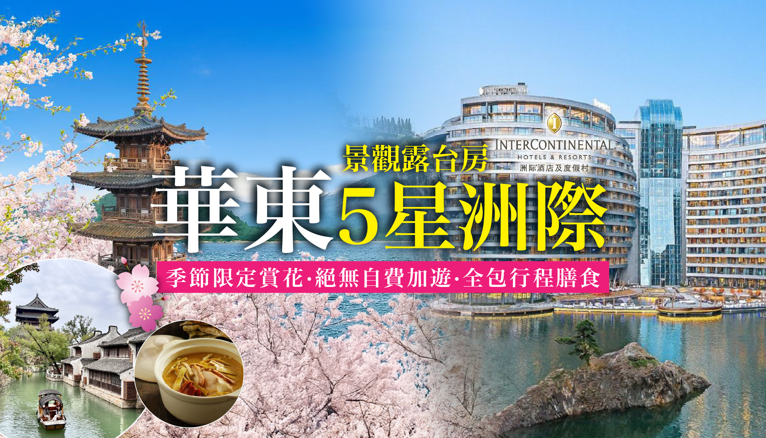 [5天] [5星華東] 上海.無錫杭州.佘山世茂洲際酒店景觀露台房.季節限定4大賞花.濮院古鎮園內宿泊.禪文化小鎮 [拈花灣].西湖新天地.馳名 [張生記老鴨煲].3晚國際5星洲際酒店.太湖有機魚頭皇.2+1座位旅遊車.[絕無自費加遊] [全包行程膳食]