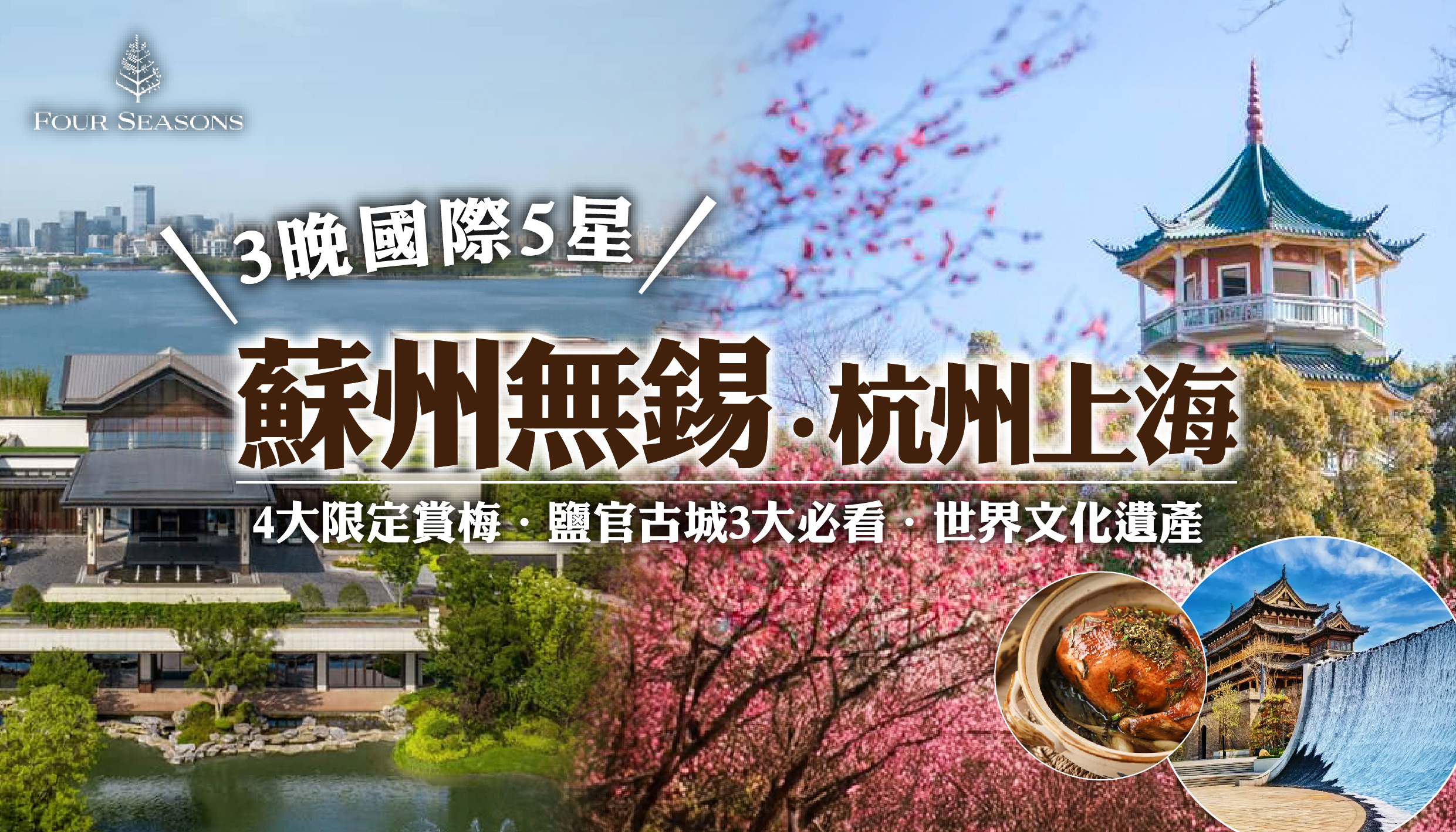 [6天] [四季洲際] 蘇州無錫.杭州上海.3晚國際5星.4大限定賞梅.鹽官古城3大必看.世界文化遺產 [京杭古運河+滄浪亭].海寧鹽官古城+蘇州金雞湖 [四季酒店]+杭州金球洲際酒店.必食名菜狀元蹄.太湖松鼠魚 [絕無自費加遊]