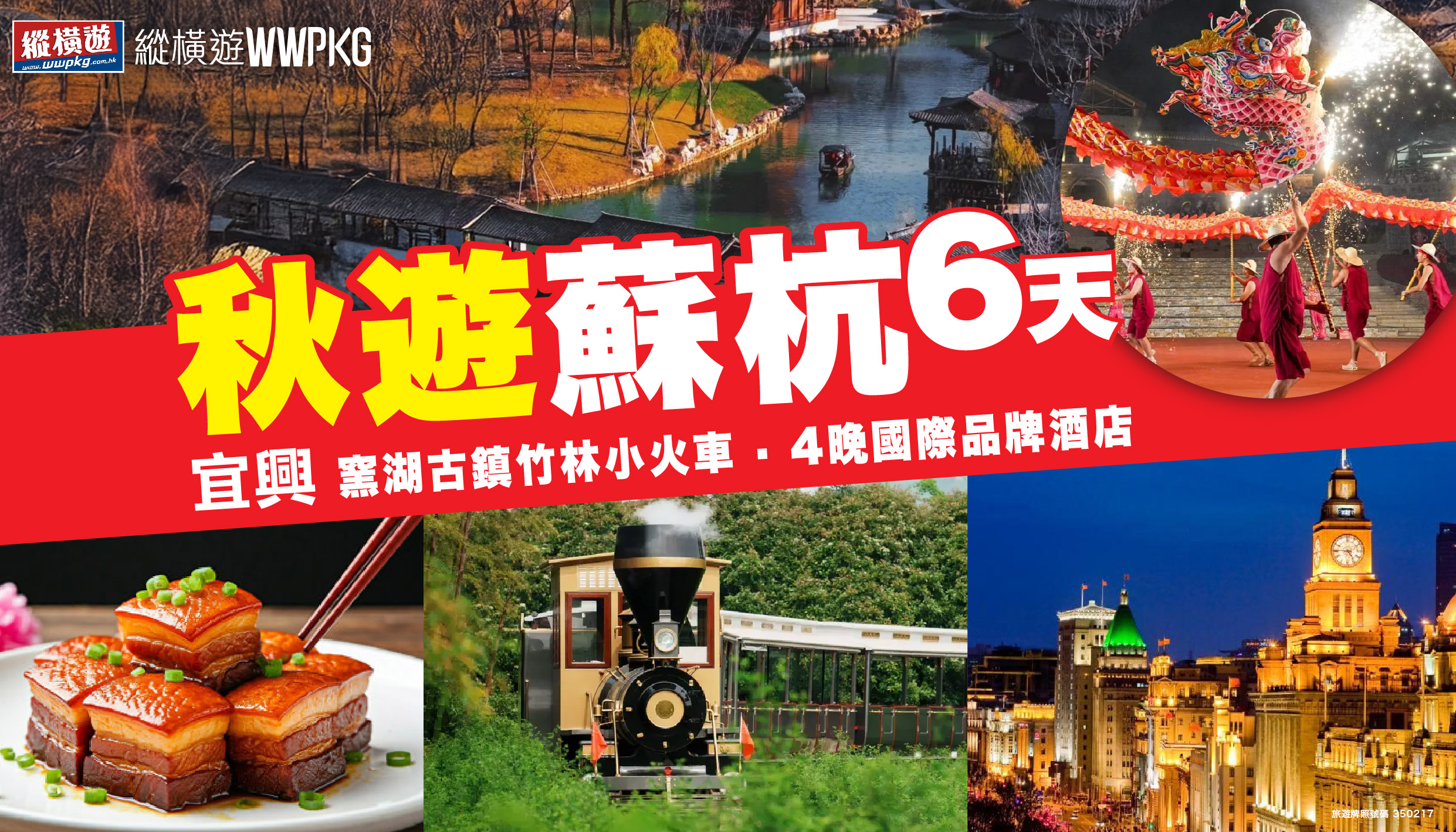 [6天] [秋遊蘇杭] 杭州.無錫.宜興.[季節限定] 4大賞秋.[窯湖古鎮] 竹林小火車+龍行水表演.蘇州千年古剎 [寒山寺]+國家4A級 [七里山塘街].世界文化遺產 [南長街清明橋文化街區].太湖魚頭皇+大閘蟹.松鼠魚+醉蟹.1晚古鎮+4晚國際品牌酒店 [絕無自費加遊]