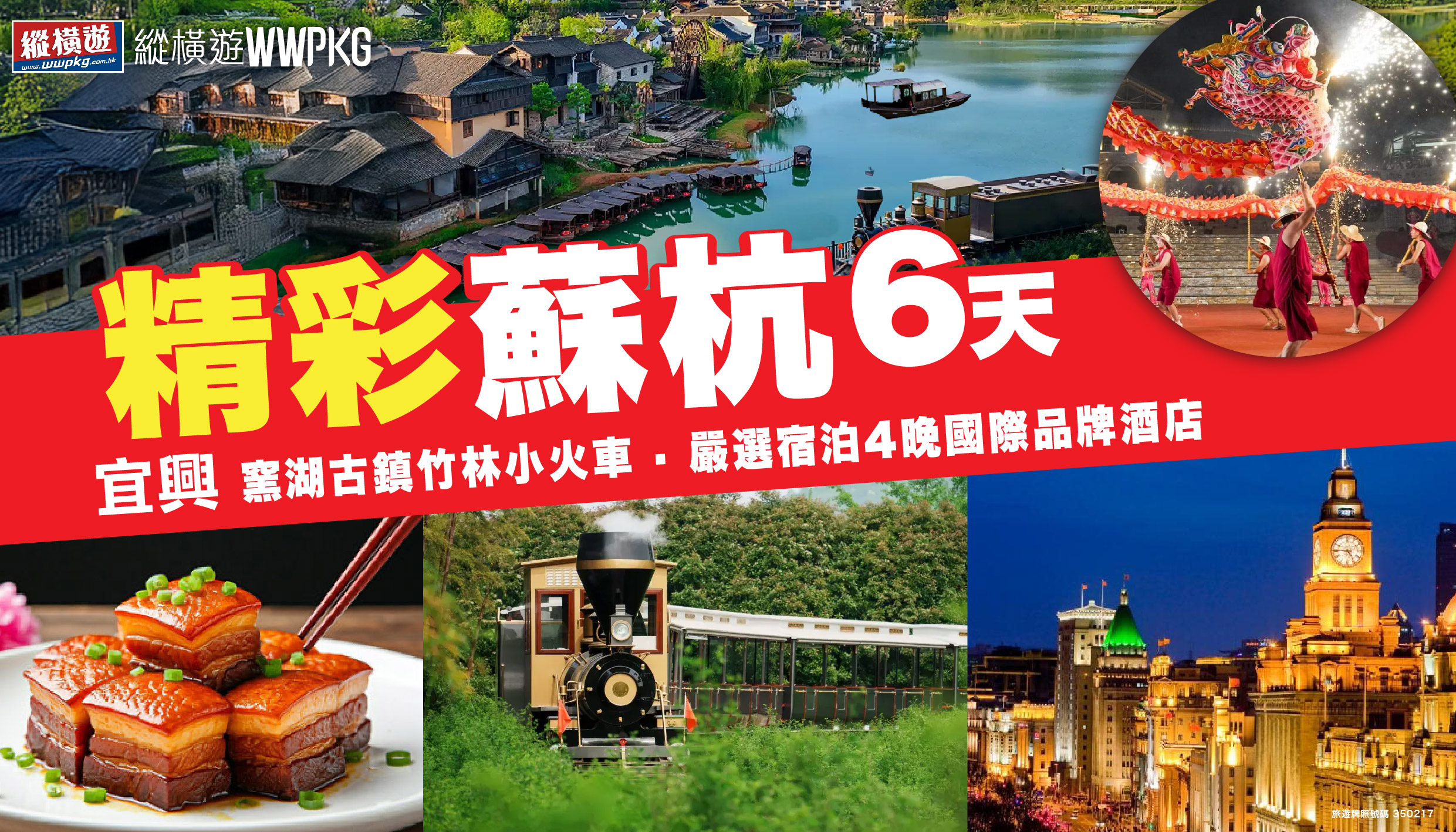 [6天] [精彩江南] 宜興蘇州.杭州無錫上海.[窯湖古鎮] 龍行水表演.竹林小火車全覽古鎮美景.世界文化遺產 [南長街清明橋文化街區].3大國家級 [蠡園+寒山寺+七里山塘街].黃浦江外灘美景. 太湖魚頭皇.4晚國際品牌+1晚窯湖小鎮內酒店 [全包行程]