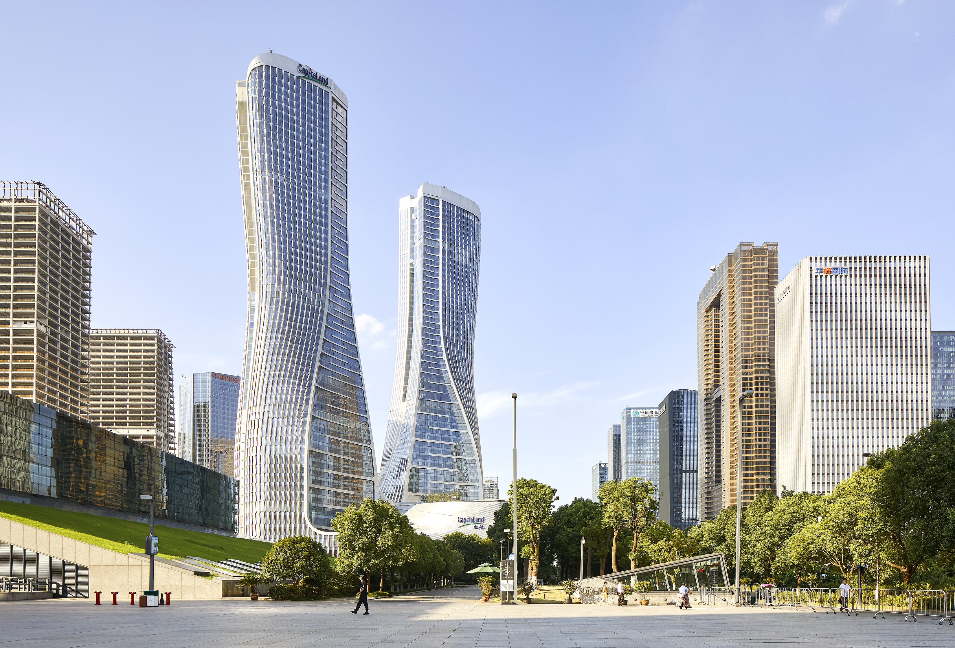 【杭州 CBD 大型「萊福士」購物中心】設計理念源於錢塘江潮水的獨特外型,杭州市民稱此為「小蠻腰雙子塔」