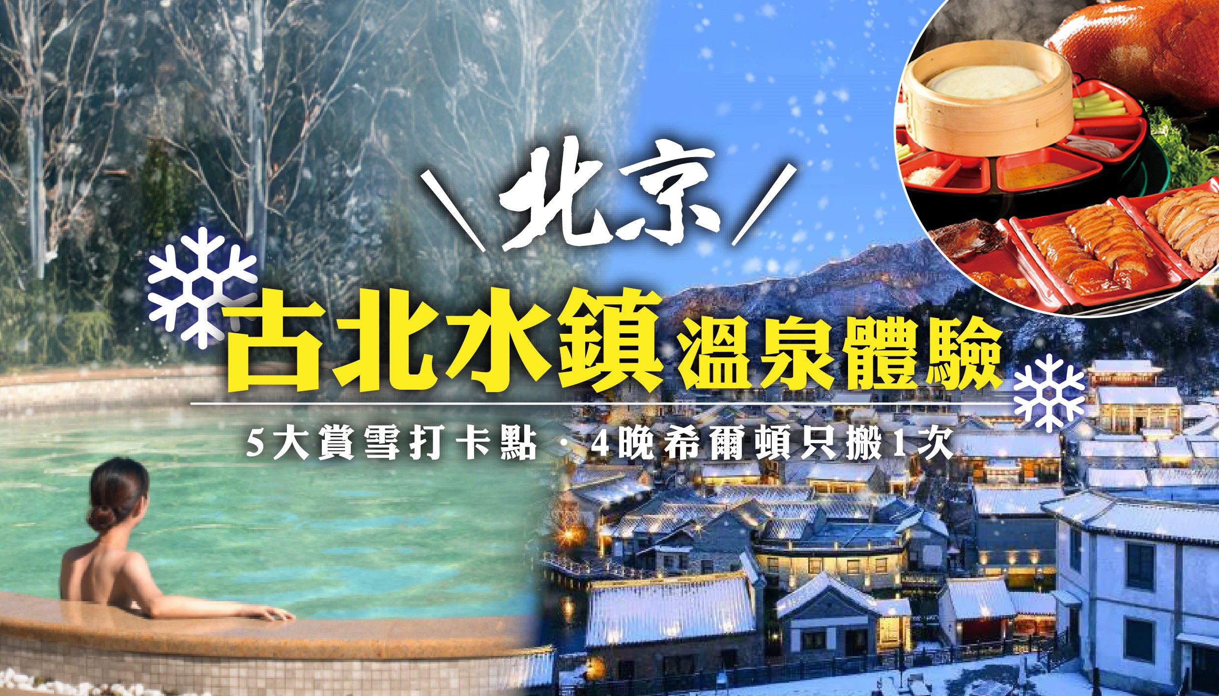 [6天] [首都雪趣] 北京.長城腳下 [古北水鎮+大眾溫泉體驗].必遊4大世產 [故宮+天壇+頤和園+司馬台長城包纜車].5大賞雪打卡點.什剎海冰湖.冬奧比賽場地 [首鋼園大跳台] .首都最大佛教寶庫 [雍和宮].北京盛世烤鴨.4晚希爾頓只搬1次