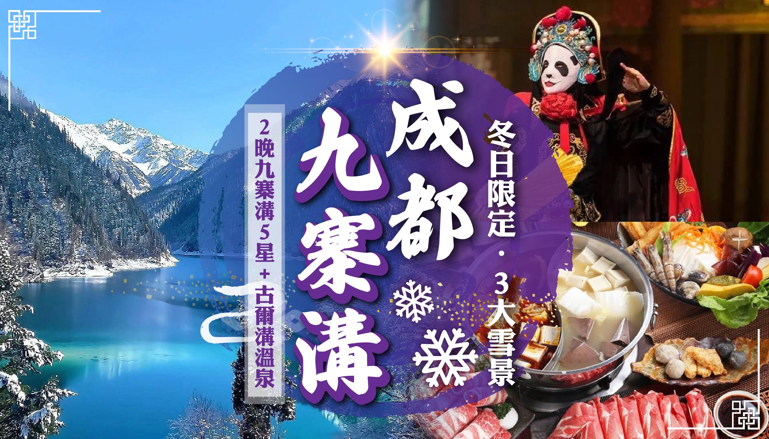 [8天] [雪影世界] 成都九寨溝.3大雪景.2晚九寨溝5星+古爾溝溫泉.世產九寨溝.川西小瑞 士畢棚溝.人間仙境牟尼溝.芙蓉川劇變臉秀.驚艷全球 [都江堰熊貓樂園+千年水利工程].仰天窩 [超巨熊貓]打卡.寬窄巷子.欽善齋藥膳VIP包廂.盛世錦城鴛鴦火鍋 [絕無自費加遊+指定購物站]