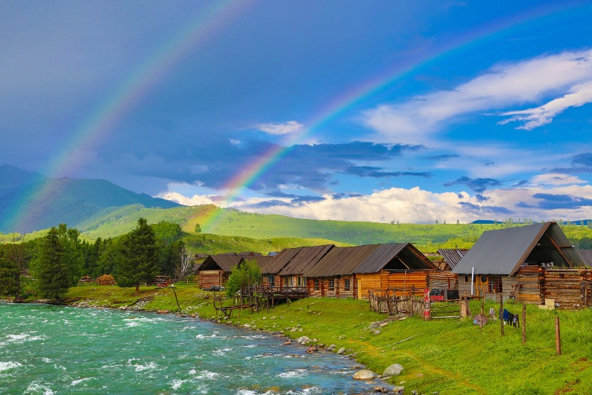 【禾木.包景區區間車】區中樸素的小木屋分佈在谷裡,景觀如童話 + 禾木村 有「中國最美的鄉村」之美譽