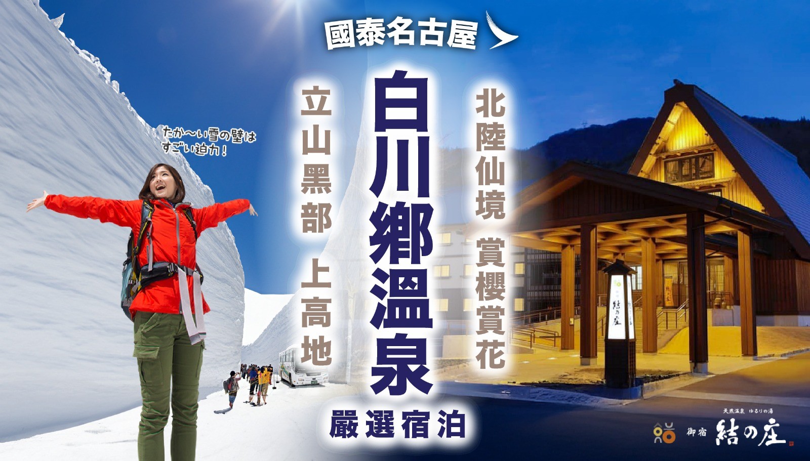 [6天] [罕有入住] 立山黑部.白川鄉「御宿結之庄溫泉」.唯一淨土 [上高地].北陸仙境.世產童話村 [白川鄉.合掌村 ].一年一度 [礪波鬱金香祭 300萬株].峽谷絕景 [庄川峽遊船].花花牧歌之里.渚百選 雨晴海岸.金華山纜車.富山灣時令壽司.蟹料理9品 [可提升私人風呂]
