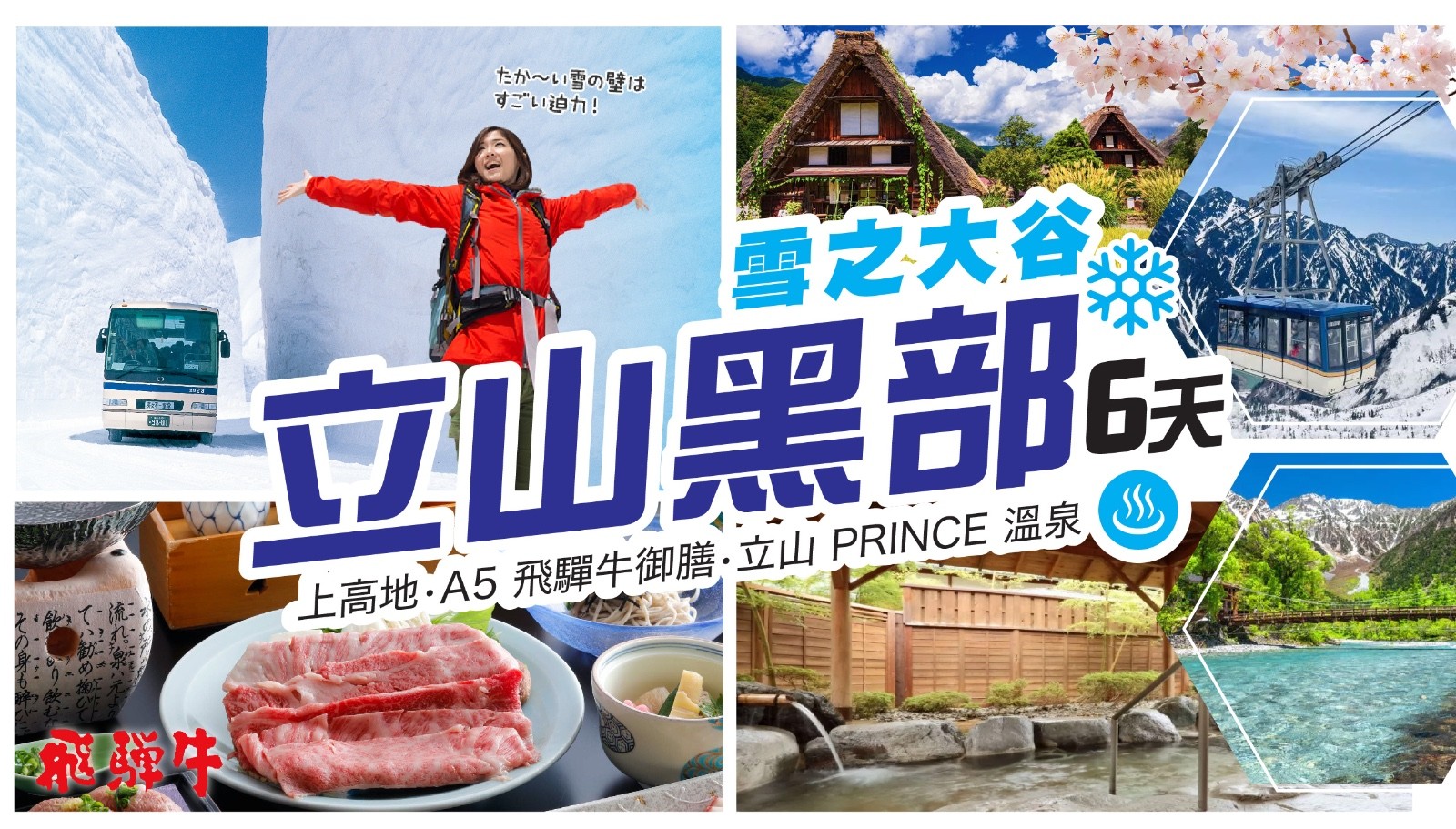 [6天]【阿爾卑斯】立山黑部.雪之大谷.神的唯一淨土[上高地].世產童話村 [白川鄉.合掌村].名古屋鶴舞公園.高山小京都 [上三之町].花博記念公園. A5飛驒牛 朴葉味噌燒御膳.名古屋 THE B.松本花月溫泉.2晚溫泉 [第二位50%OFF.月曆示第二位價格]