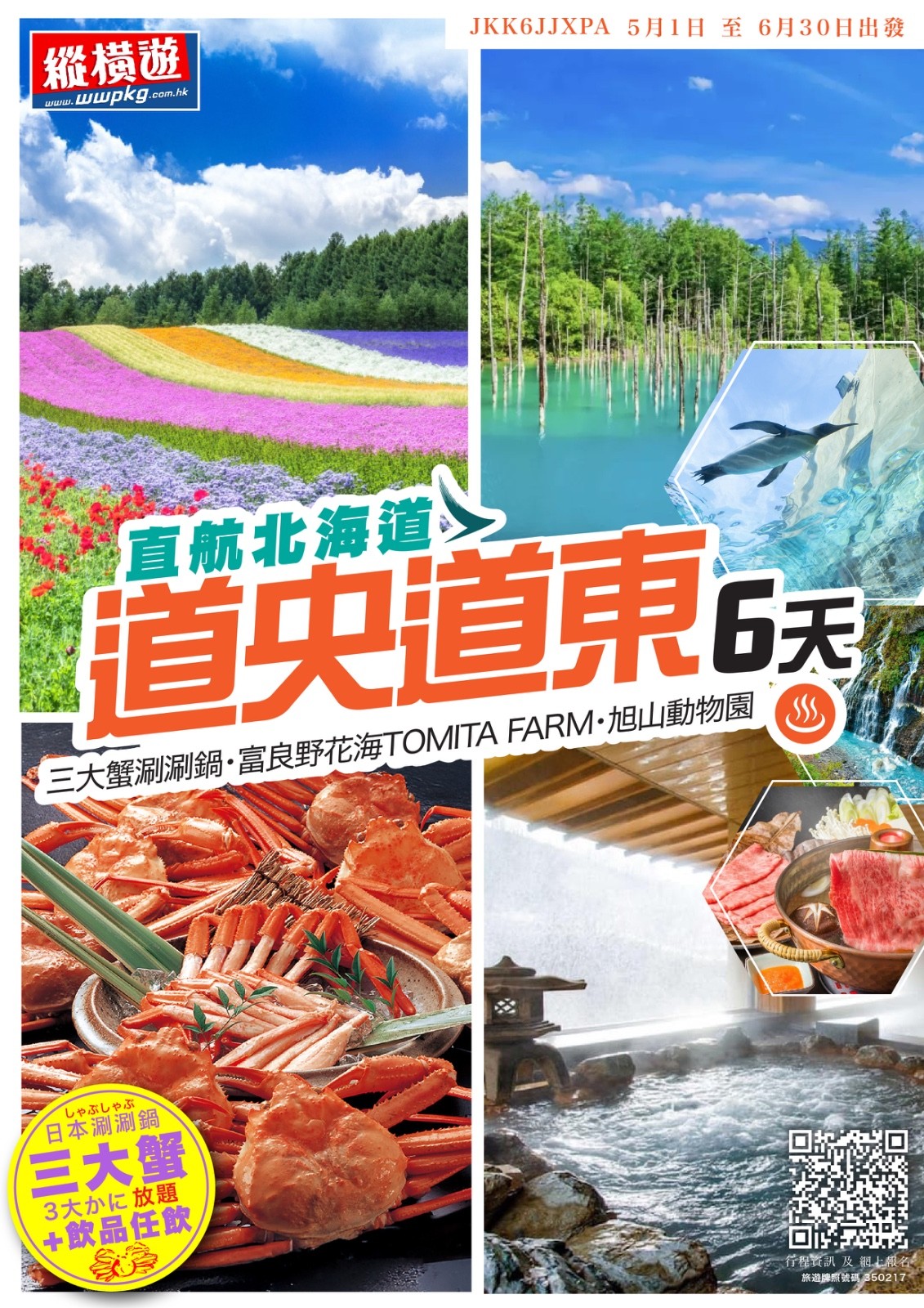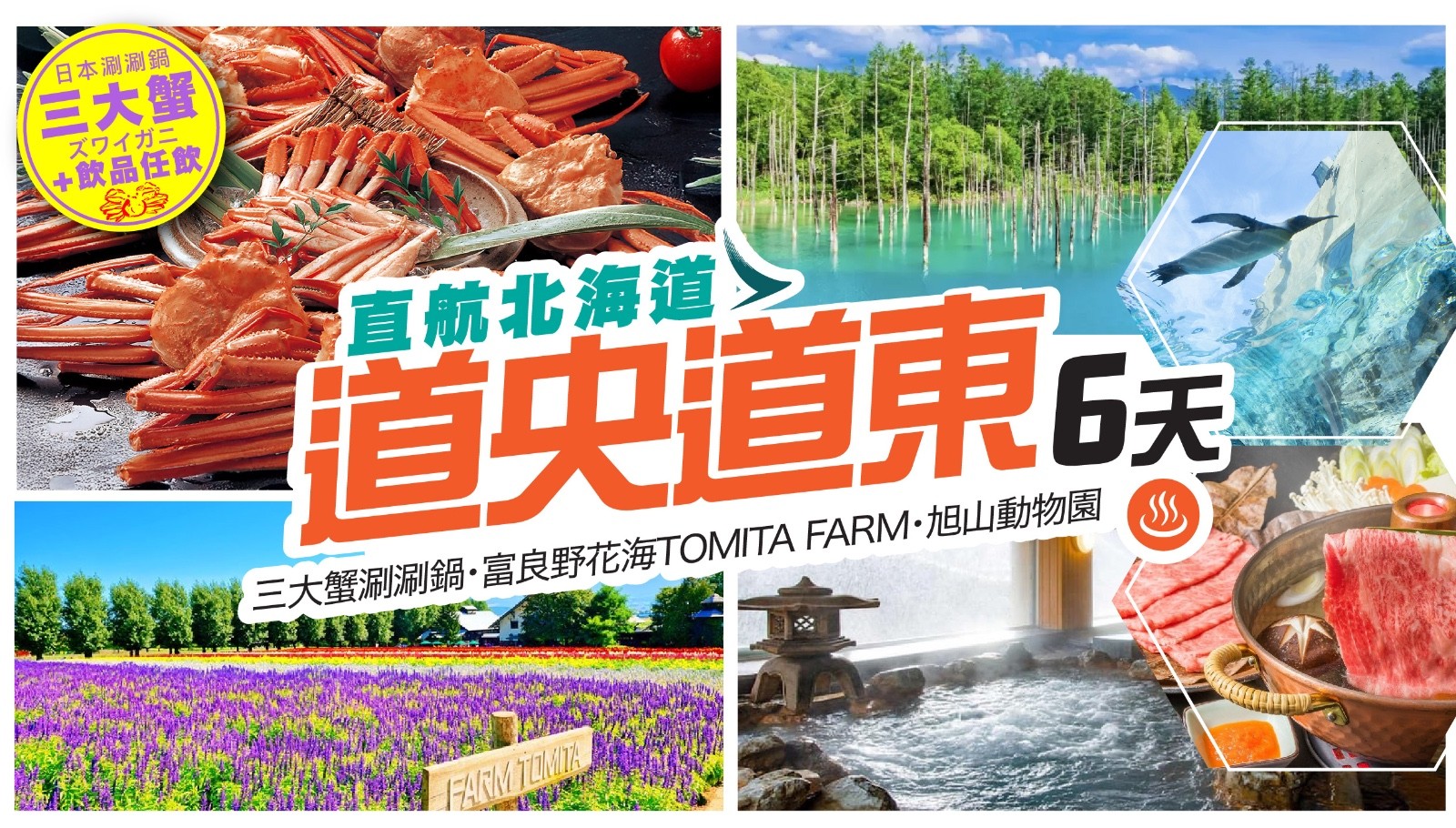[6天] [必去必吃] 直航北海道 [道央+道東].登別札幌.旭川富良野. 3大蟹🦀+和牛涮涮鍋放題+酒水任飲.人氣NO.1旭山動物園. 富良野花海TOMITA FARM.自然奇景美瑛青池.360°絕景室蘭地球岬.2晚嚴選溫泉 [第二位50%OFF.月曆示第二位價格]