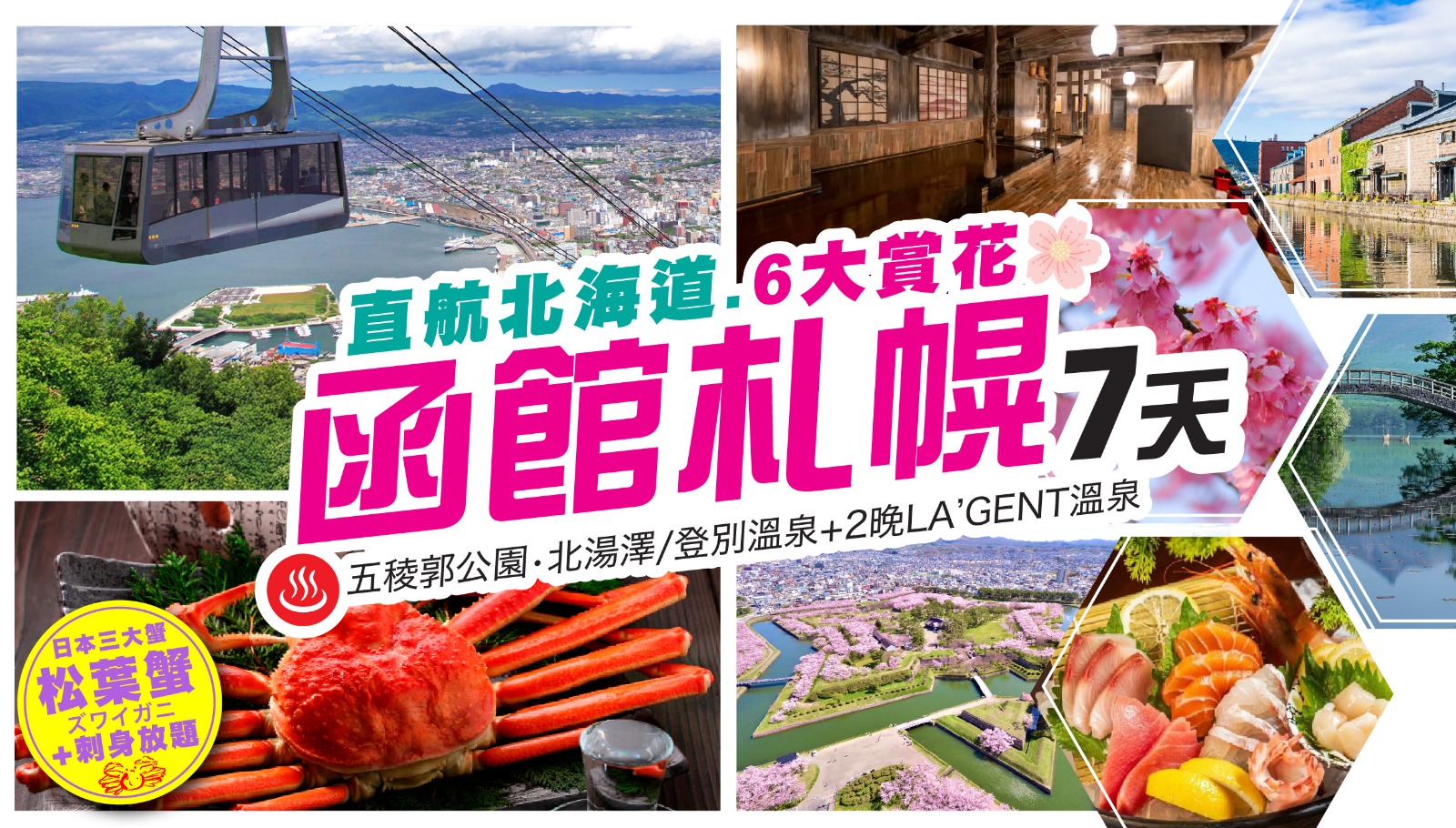 [7天] [春遊函館] 國泰北海道.函館札幌.松葉蟹刺身放題. 2晚函館 LA’GENT 溫泉+北湯澤溫泉.大沼國定公園.米芝蓮名所「函館美景+五稜郭公園+金森紅磚倉庫地」.漫遊小樽.富士羊蹄山.漫遊小樽.鶴雅創作料理 DINING.3晚札幌 IBIS⚡[第二位50%OFF.月曆顯示第二位價格]