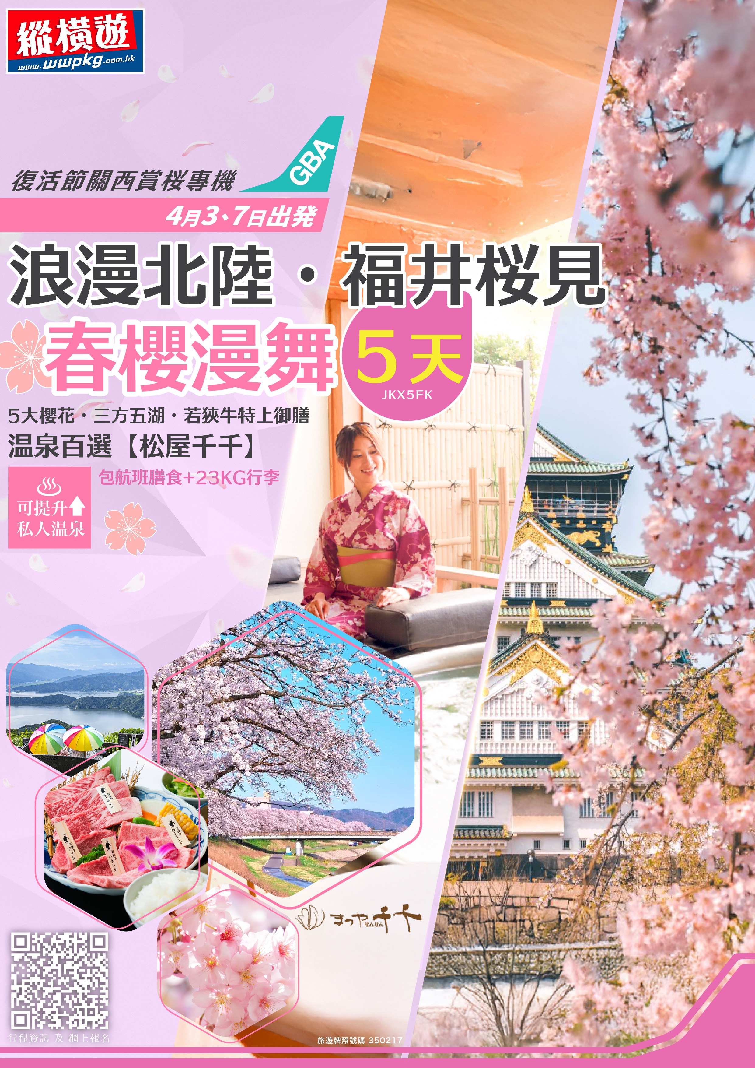 [5天] [春櫻漫舞] 福井三方五湖.5大櫻花.溫泉百選 [松屋千千].片山津溫泉 [佳水鄉].童話京都美山合掌村. 櫻花百選 [足羽川櫻並木+丸岡城+海津大崎+大阪城公園].東尋坊. 若狹牛特上御膳.京都寶池王子大飯店.2晚溫泉 [可提升私人溫泉] [復活節專機]