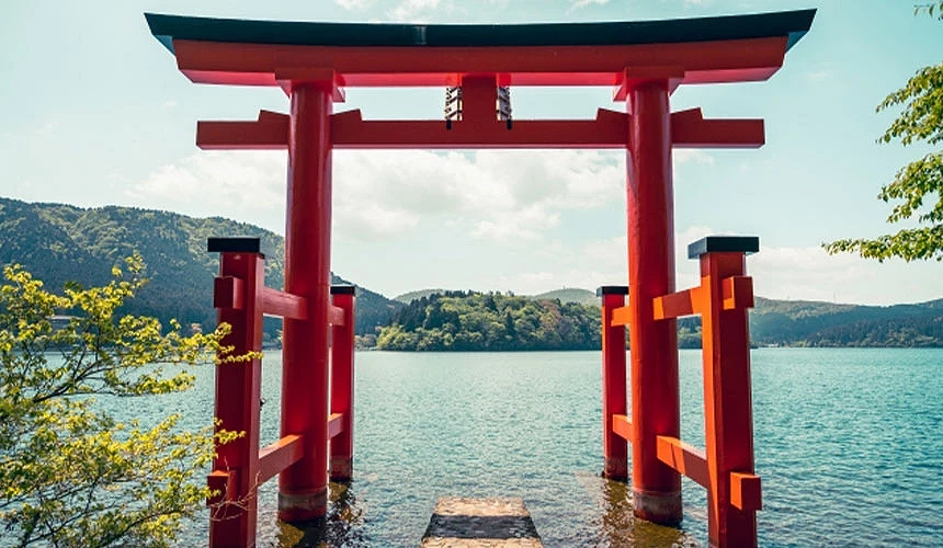 【箱根神社】水上鳥居 神社背靠箱根群山