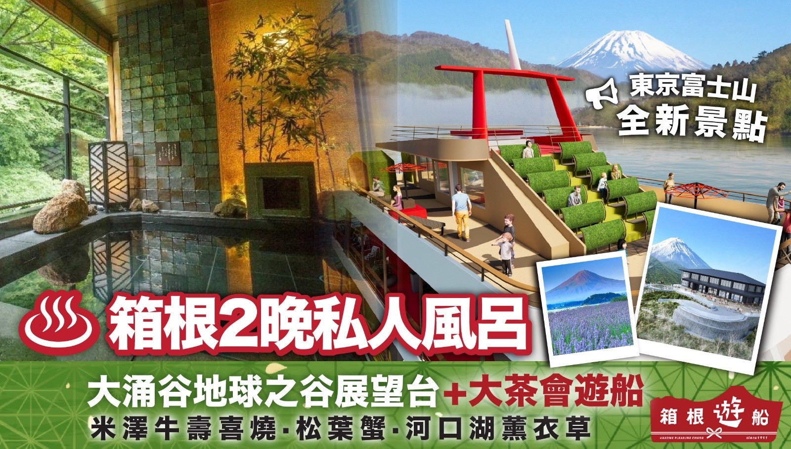 [6天] [關東經典] 東京富士山.箱根2晚「芒之原一之湯」私人風呂 [米澤牛壽喜燒晚餐].新景點 [大茶會遊船+大涌谷地球之谷展望台].鎌倉江之島.河口湖薰衣草.山中湖花海.半天吊單軌電車.橫濱港未來21.松葉蟹+和食放題+酒水放題.2晚東京JR VIA 酒店