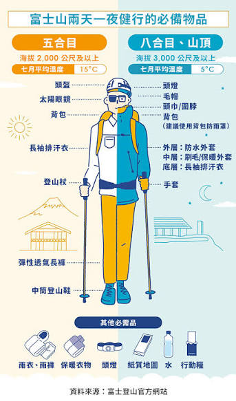 .包含: 八合目山小屋住宿, 兩餐, 英語導遊, 富士山入山費, 來回巴士, Montbell安全帽, 500ml 瓶裝水, 雨具