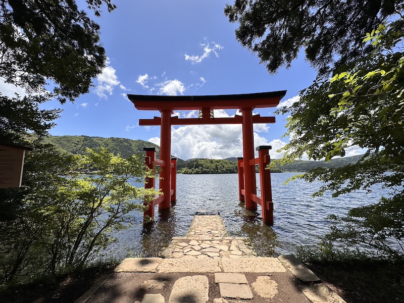 【箱根神社】湖上鳥居 神社背靠箱根群山,紅色鳥居矗立在湖面