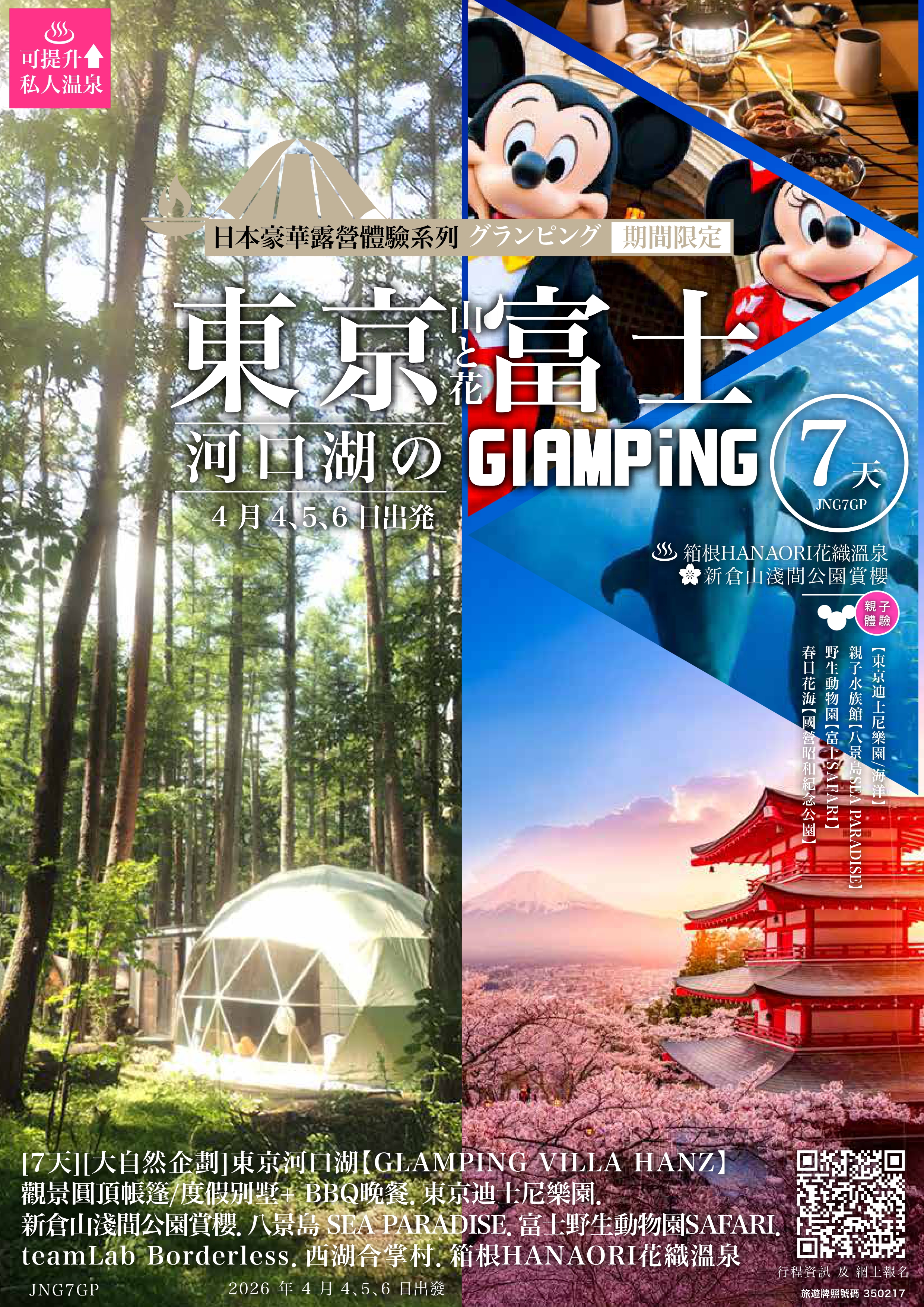 [7天] [大自然企劃] 東京河口湖【GLAMPING VILLA HANZ】觀景圓頂帳篷/度假別墅+ BBQ 晚餐.東京迪士尼樂園.新倉山淺間公園賞櫻.八景島 SEA PARADISE. 富士野生動物園 SAFARI.teamLab Borderless.西湖合掌村.箱根HANAORI花織溫泉