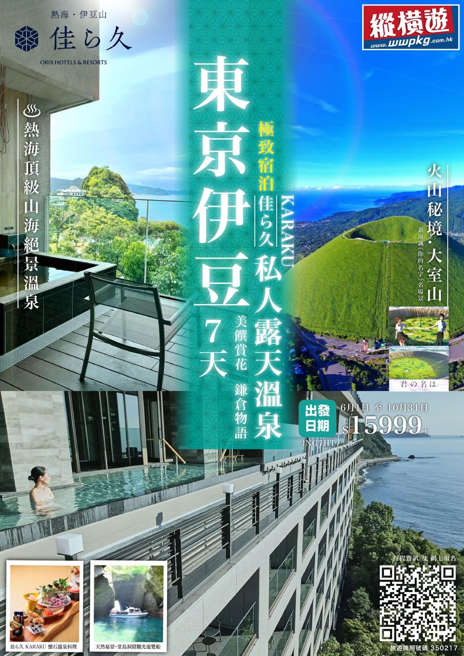 [7天] [夏天震撼] 東京伊豆.[米芝蓮 1星鑰] 伊豆山佳ら久 KARAKU 私人露天溫泉♨️.打卡熱點大室山.賞花名所 [下田繡球花祭+小田原城址公園+山中湖花都公園].鎌倉物語.堂島遊覽船.湘南MONORAIL.三島東急溫泉.三島大吊橋SKYWALK.[銀座八芳] 海鮮DINING.3晚溫泉