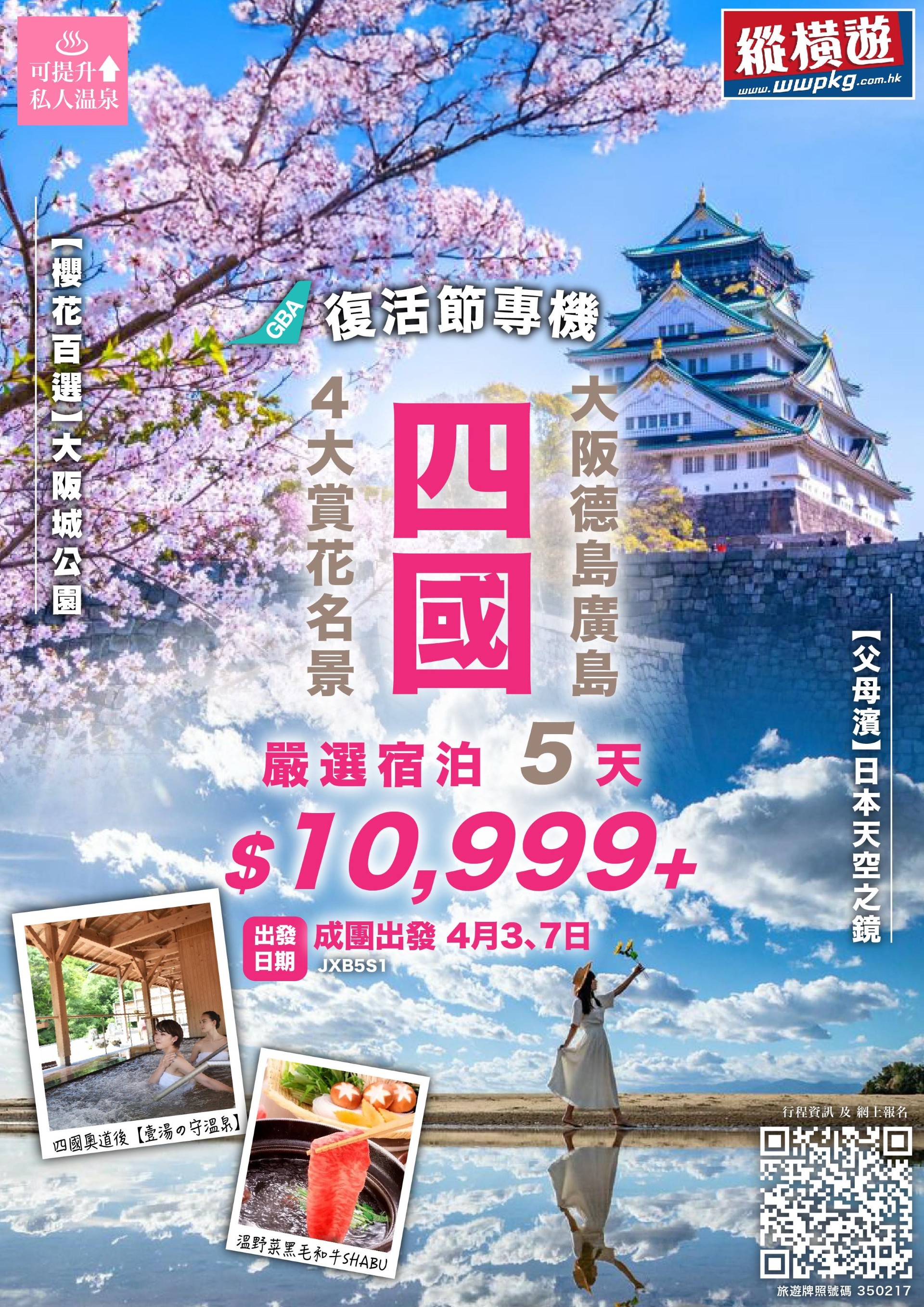 [5天] [名園名景] 四國德島廣島.4大賞花.天空之鏡 [父母濱] .[櫻花百選] 大阪城公園.大步危峽遊船.旅館百選【琴参閣】‧ 四國奧道後【壹湯の守溫泉】.世產嚴島神社.德島鳴門漩渦.和三盆和菓子.溫野菜黑毛和牛SHABU.名園名景 [可提升私人溫泉] [復活節專機]