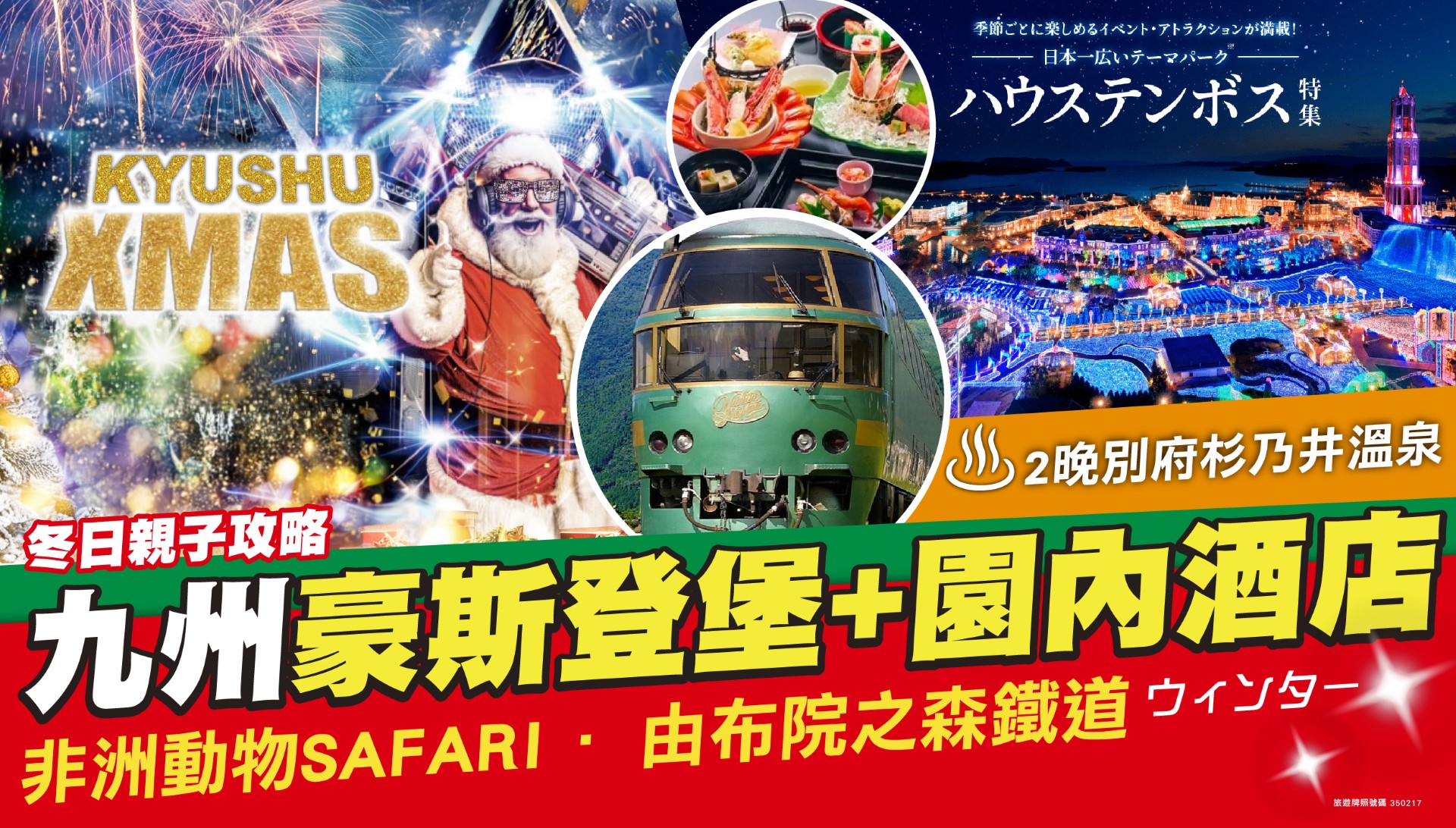 [6天]【聖誕九州】九州福岡.豪斯登堡DENHAAG酒店 [NO.1 光之王國]. 由布院之森鐵道.2晚別府杉乃井/和藏溫泉.聖誕市集LIGHTUP.KUJU PARK嬉雪.非洲動物 SAFARI.別府空中纜車.[蟹本家] 7品料理.CANAL CITY光影音樂匯演