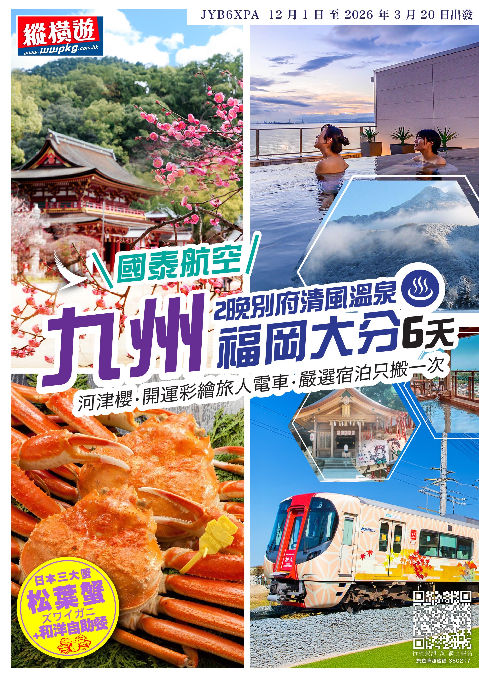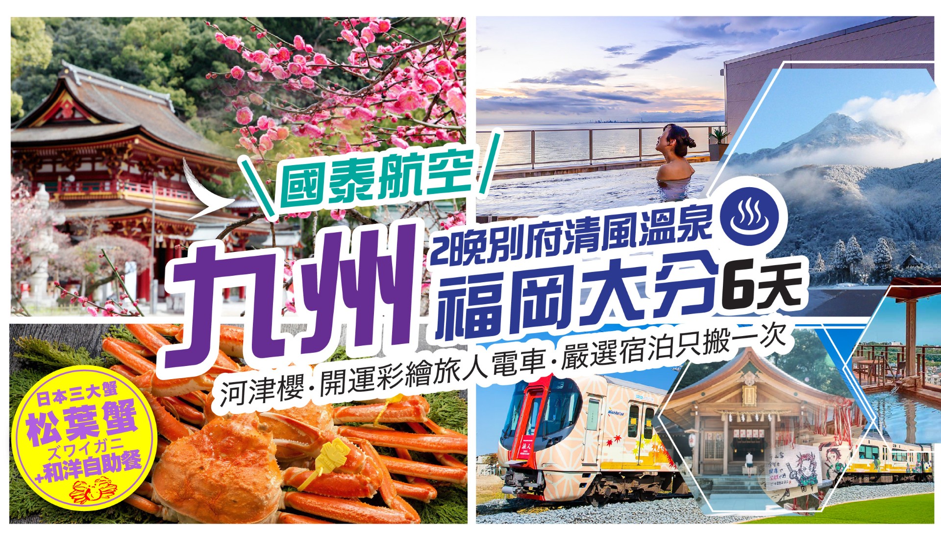 [6天] [冬遊九州] 國泰航空.福岡大分.2晚別府清風溫泉 [松葉蟹放題+和洋自助餐].大分四浦半島 5000棵河津櫻. 博多光之街點燈.太宰府梅花. 開運彩繪旅人電車.鬼滅之刃 竈門神社.3晚天神 MONTE HERMANA 酒店⚡[第二位50%OFF.月曆顯示第二位價格]