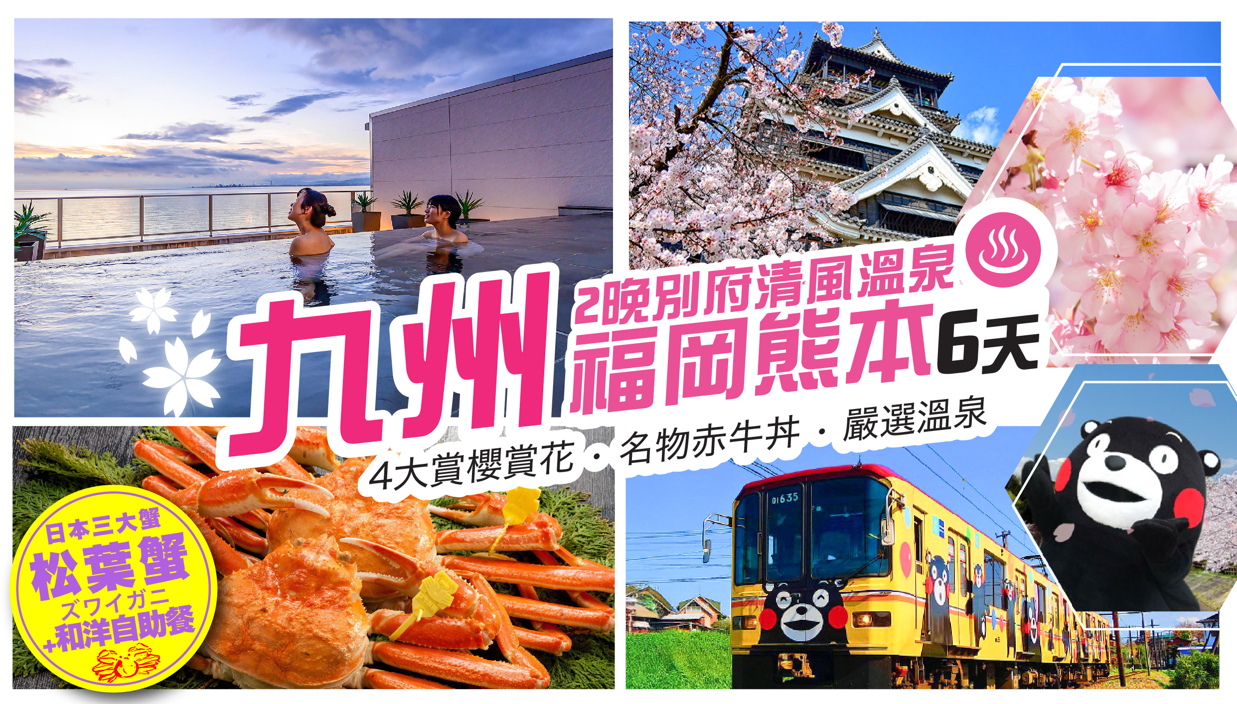 [6天] [熊出沒注意] 國泰航空.九州熊本.別府福岡.熊本熊巨大雕像+彩繪電車. 2晚別府清風溫泉 [松葉蟹放題+和洋自助餐].櫻樹 3000 棵菊池公園.櫻花百選[熊本城].阿蘇名物 赤牛丼.2晚天神 MONTE HERMANA.4大賞櫻賞花⚡[第二位50%OFF.月曆顯示第二位價格]
