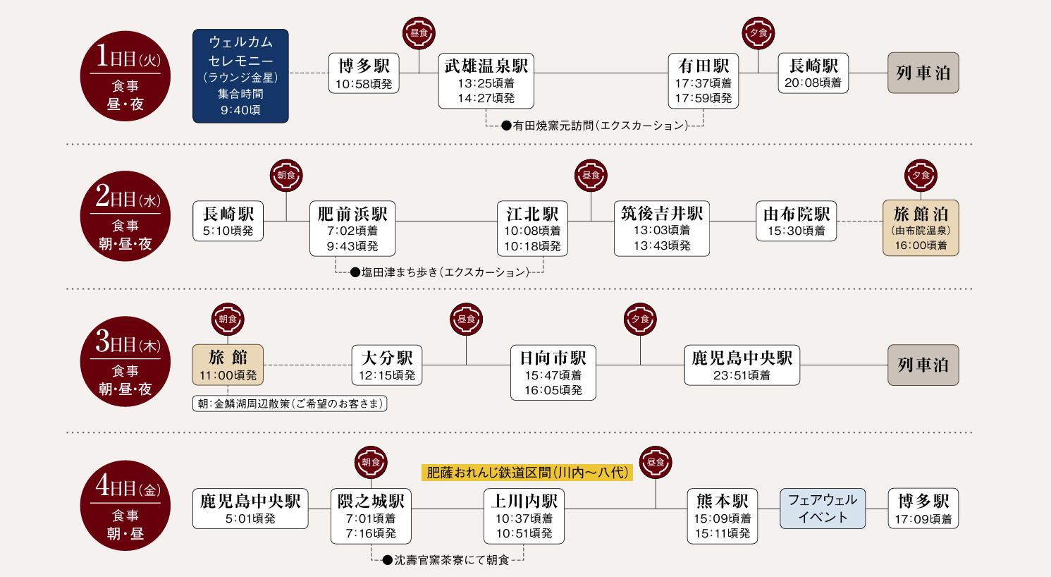 鐵道界的Rolls-Royce.30億打造「移動美術館」.許多人畢生願望清單之一 [中選率只有4.1%] .柳川暖桌船.第一吊橋【九重夢吊橋】.武雄溫泉駅 有田燒陶窯.鹽田津老街散策.漫步湯布院.日向利休庵和菓子 DIY 體驗.柳川名物 [對月樓] 蒲燒鰻魚.蟹本家10品料理.佐伯壽司御膳