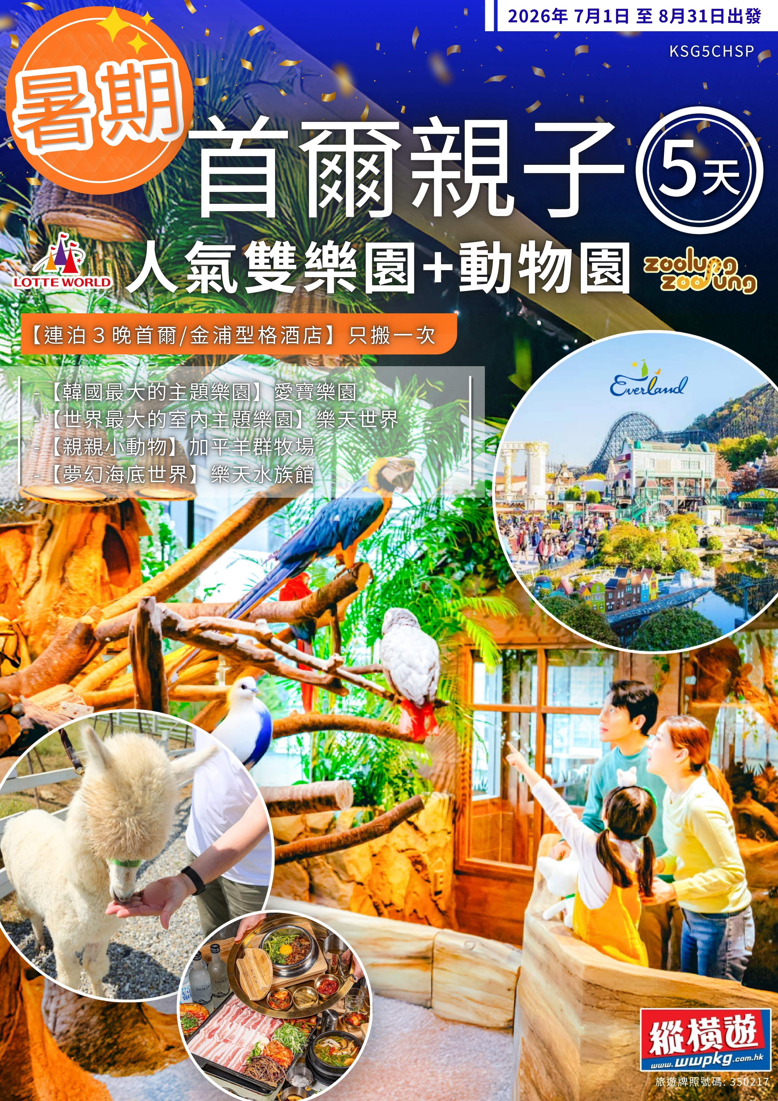 [5天] [暑期親子] 首爾+京畿道 [人氣雙樂園] 愛寶樂園+樂天世界.[夢幻海底世界] 樂天水族館.[親親動物] 羊群牧場Cloud Hill.ZOOLUNG ZOOLUNG動物園.<新>彩繪秀HERO SHOW.[親子體驗] 韓服體驗+紫菜飯卷DIY.[米芝蓮推介] 滋補人蔘雞.絕無自費加遊