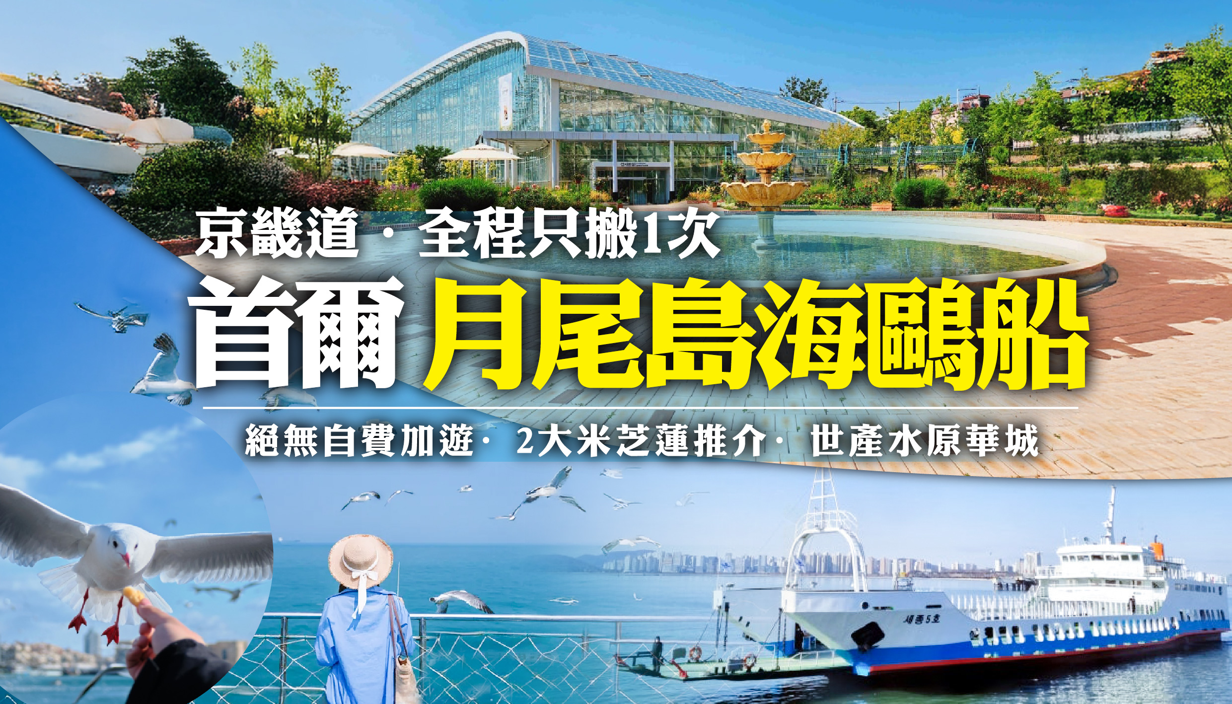 [5天] 首爾+京畿道 [與海鷗翱翔] 月尾島海鷗船.[四季皆美] 首爾林公園.[世產] 水原華城.[水原地標] STARFIELD星空圖書館2.0.[韓劇拍攝地] 日月樹木園.[東北亞最大] INSPIRE娛樂城.2大米芝蓮推介美食 [只搬1次] [絕無自費加遊]