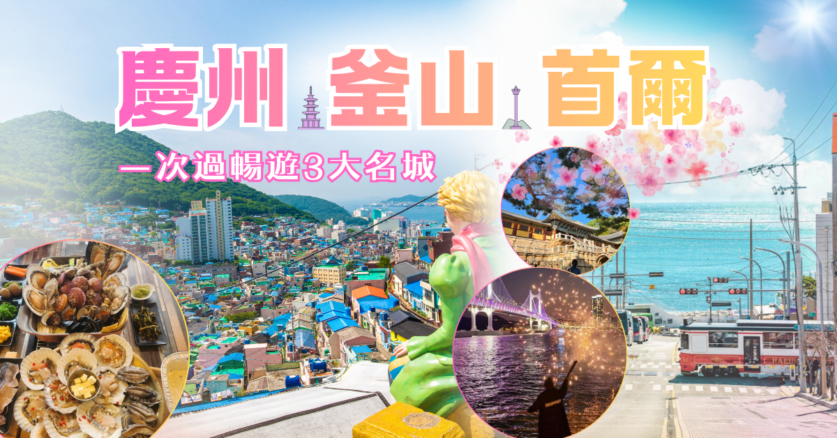[5天] 釜山+慶州+首爾.[魅力釜慶] 世產慶州佛國寺.海濱列車BLUE LINE PARK.[無邊際海景] 青沙浦踏石SKY WALK+最美鐵道+紅白燈塔.[遊艇夜遊] RIVER CRUISE.[小王子] 甘川洞文化村.釜山海鮮火鍋+燒烤