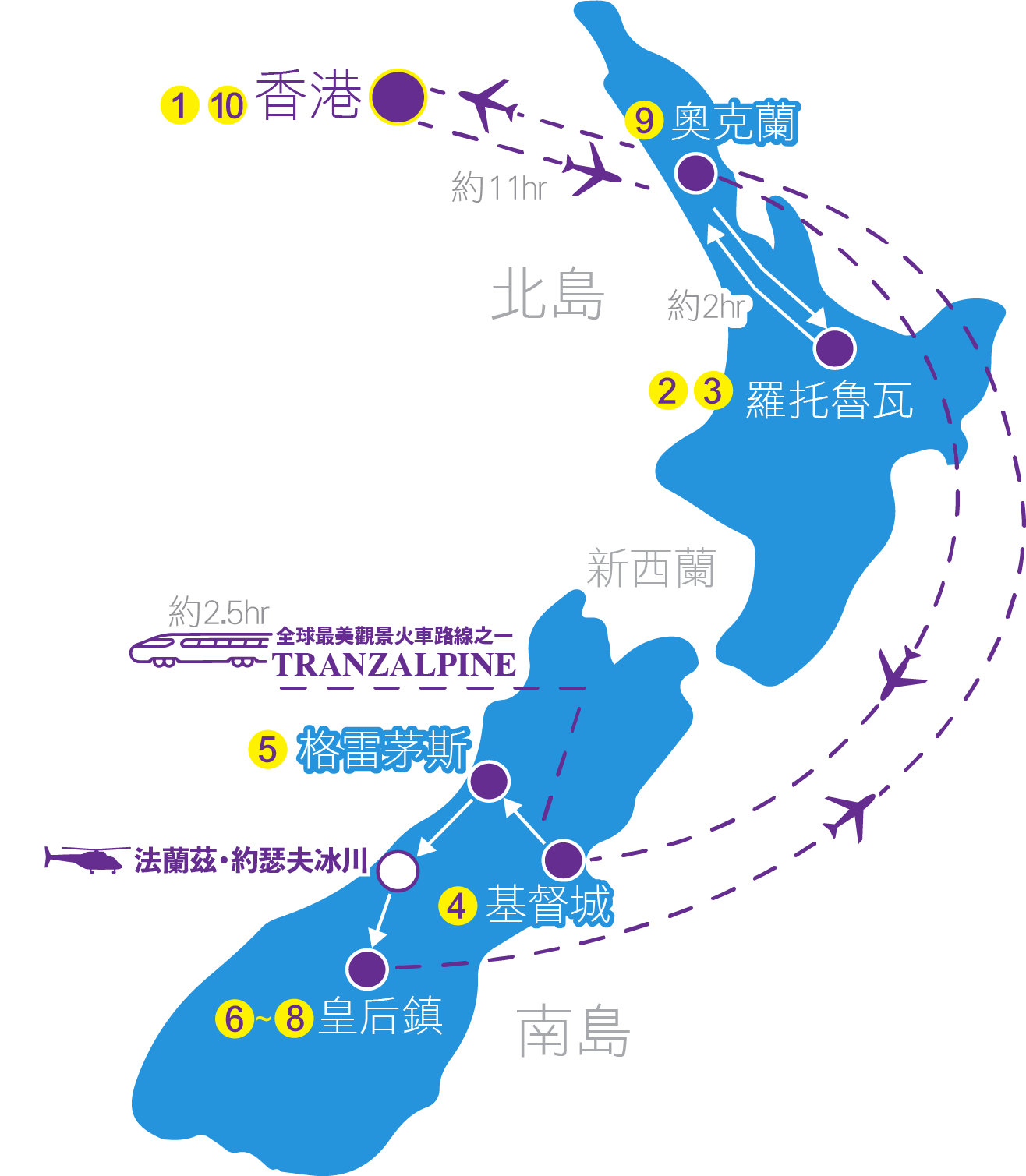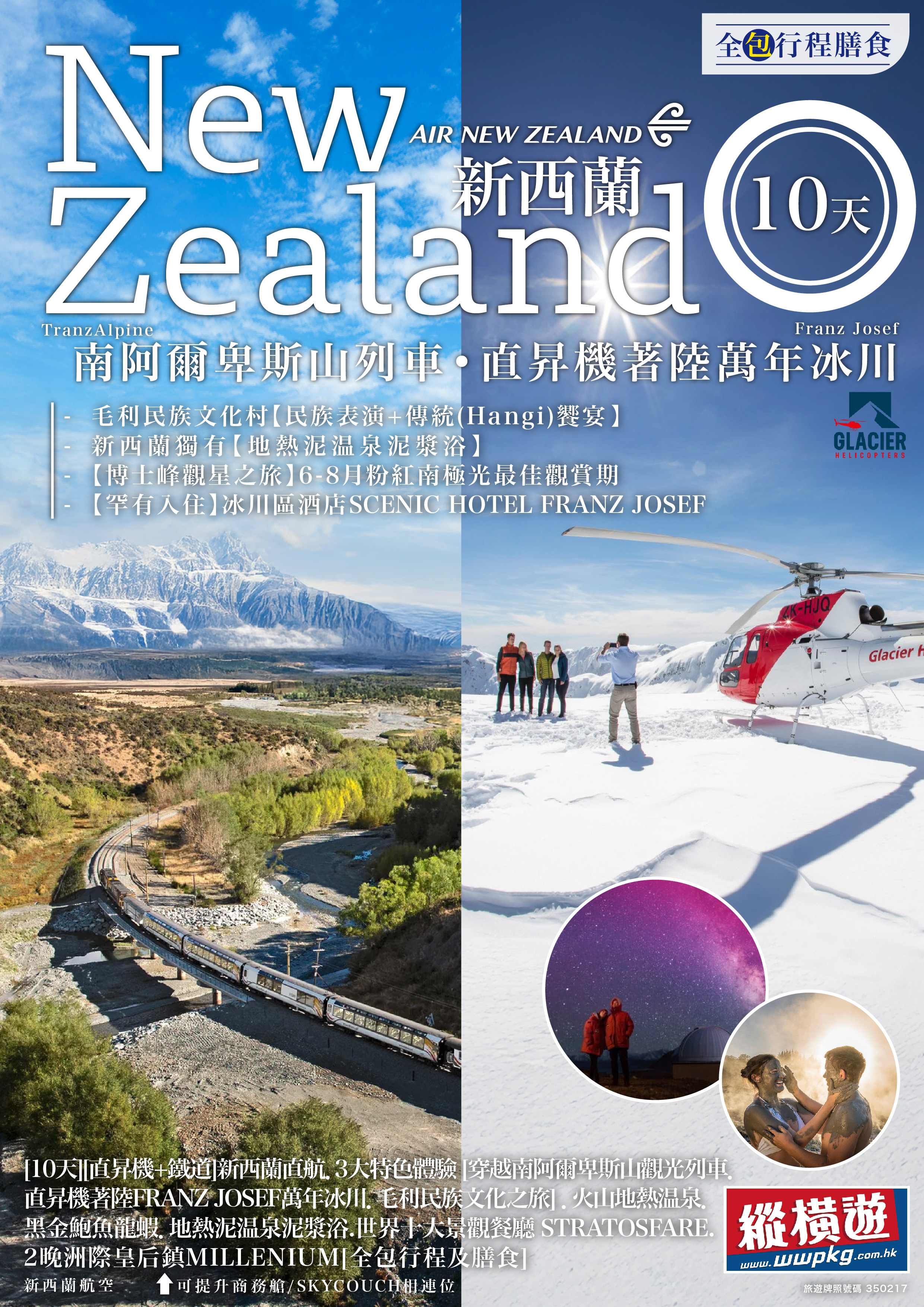 [10天] [直升機+鐵道] 新西蘭航空.15大人氣行程.6大體驗 [TRANZ 觀景列車.直升機冰川著陸.飛機暢遊美福灣.温泉泥漿浴.博士峰觀星] .7大美餚.2間天際餐廳STRATOFARE.黑金鮑魚龍蝦.3晚皇后鎮MILLENIUM [全包行程及膳食]