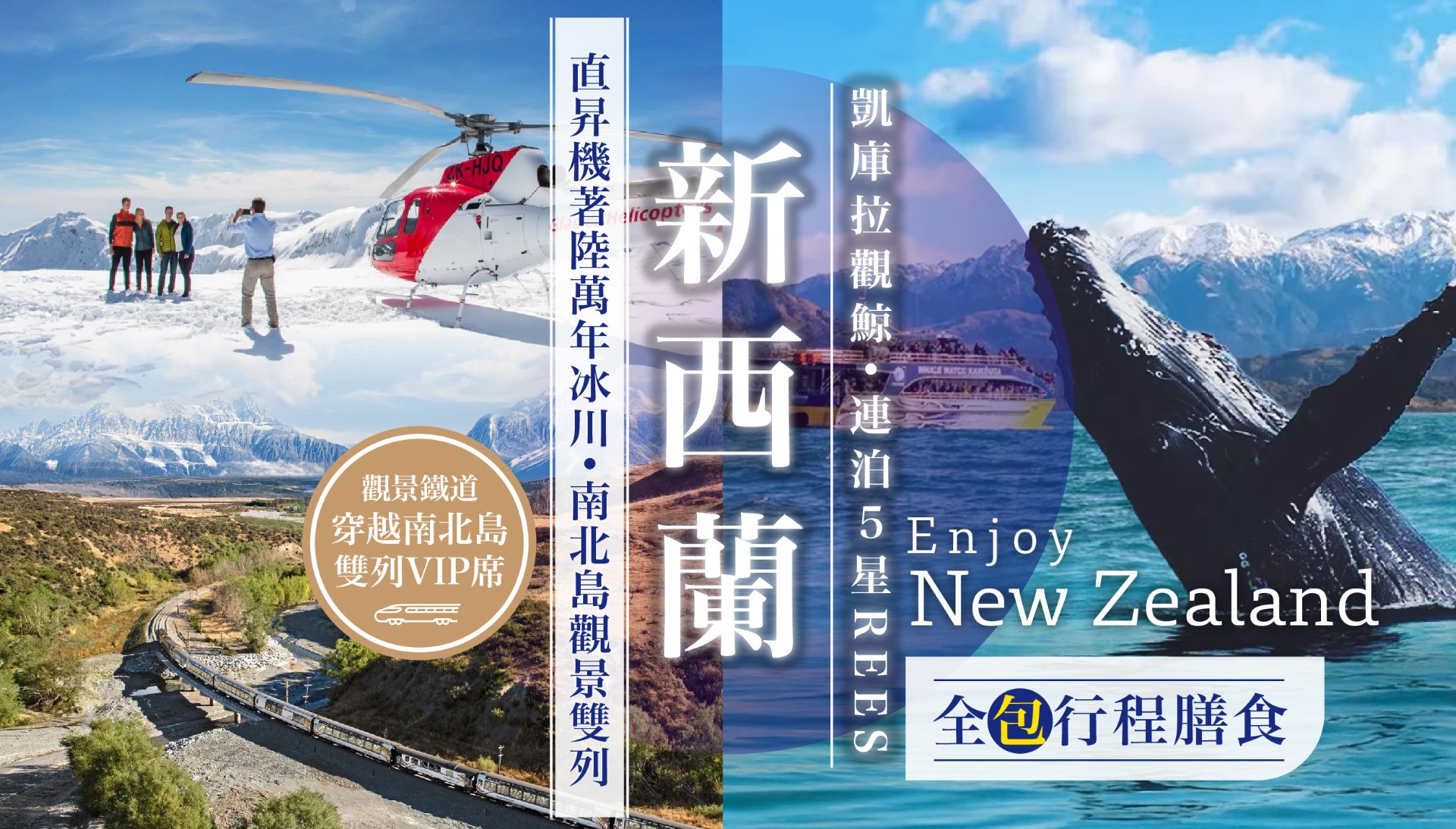 [11天] [觀鯨+雙鐵路] 新西蘭航空.19大人氣行程.8大體驗 [TRANZ +NORTHERN 觀景列車VIP席.直升機冰川著陸.飛機暢遊美福灣.抹香鯨遊船.博士峰觀星] .8大酒莊美餚.天際餐廳STRATOFARE.黑金鮑魚龍蝦.3晚皇后鎮MILLENIUM [全包行程及膳食]