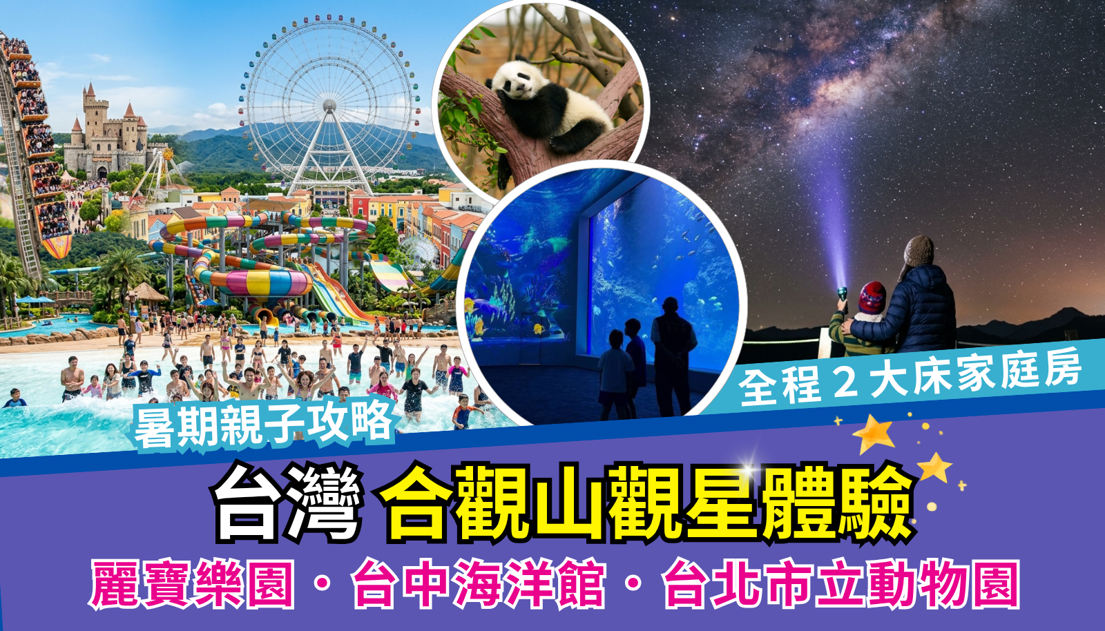 [6天] [秘境觀星] 台中台北.合歡山國際暗空公園星空攝影.麗寶樂園 [水上樂園+探索世界+親子農場+天空之夢摩天輪].台中開放式海洋館.日月潭遊船.台北市立動物園.貓空纜車.全程2大床家庭房.饗犇牛排館 [全包行程.絕無自費加遊]