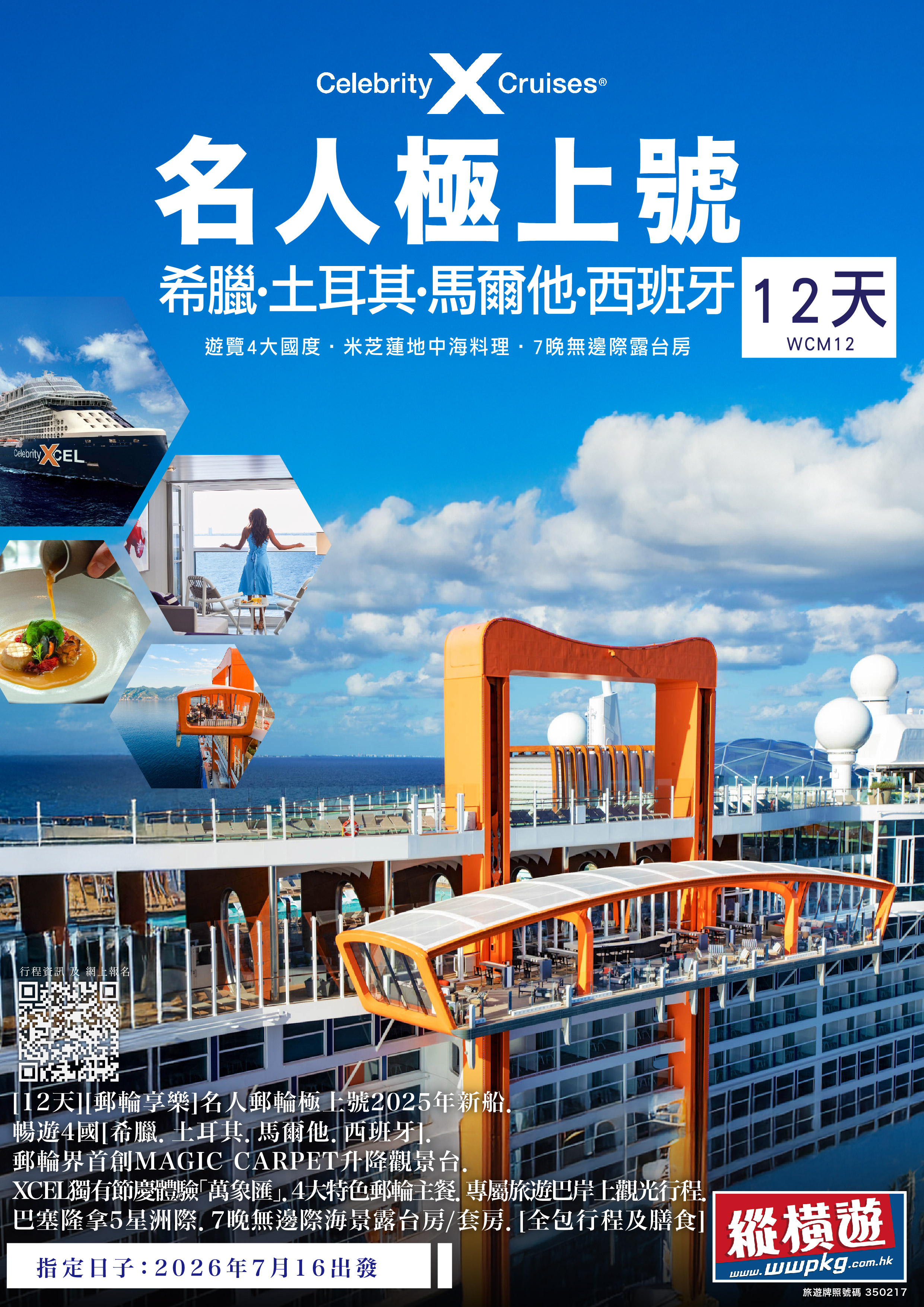[12天] [地中海航線] 🛳️名人郵輪極上號2025年新船 .暢遊4國 [希臘.土耳其.馬爾他.西班牙].專屬旅遊巴全包岸上觀光行程 + 全程膳食.專業領隊隨團出發.米芝蓮GRAIN STREET地中海料理.巴塞隆拿5星洲際.7晚無邊際海景露台房/套房.[全包行程及膳食]